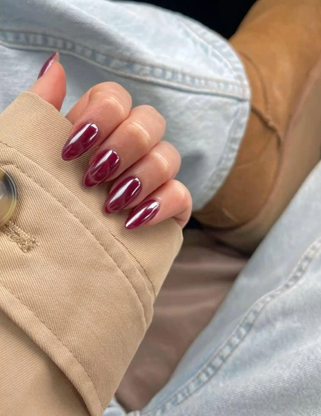 Клюквенная глазурь — это насыщенный ягодный оттенок, припыленный жемчужным слоем сахарной глазури. Этот маникюр выглядит ярко и сочно, но при этом не слишком кричаще. В зимний сезон он особенно хорош: нарядный, яркий и прекрасно комбинирующийся с теплыми нарядами.