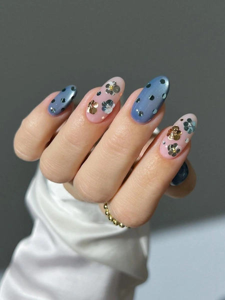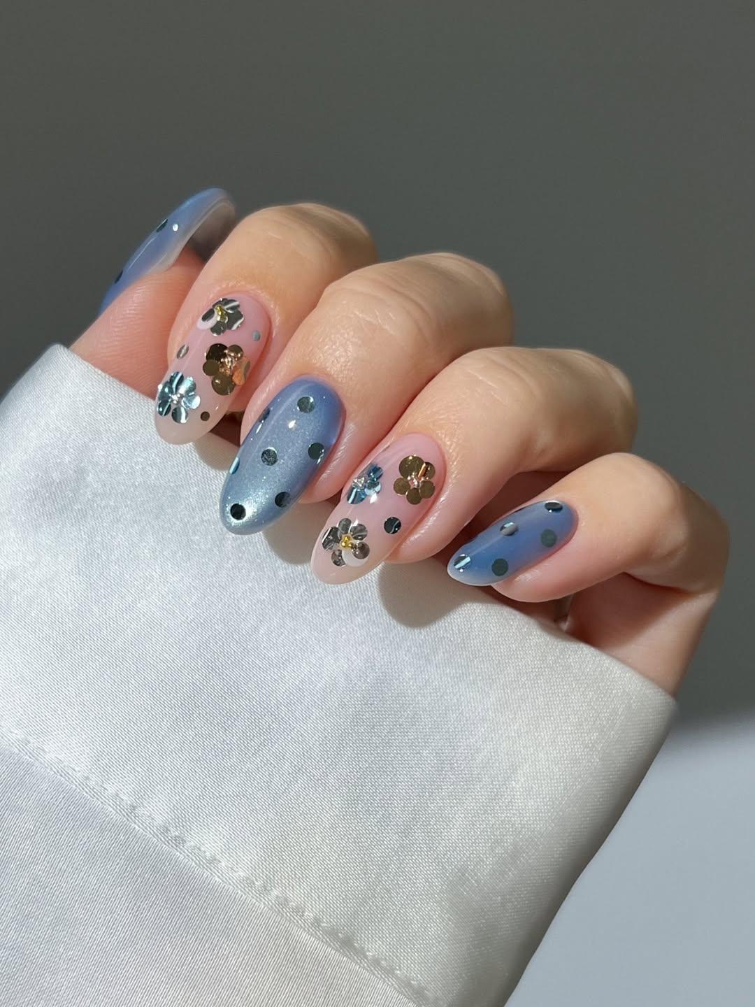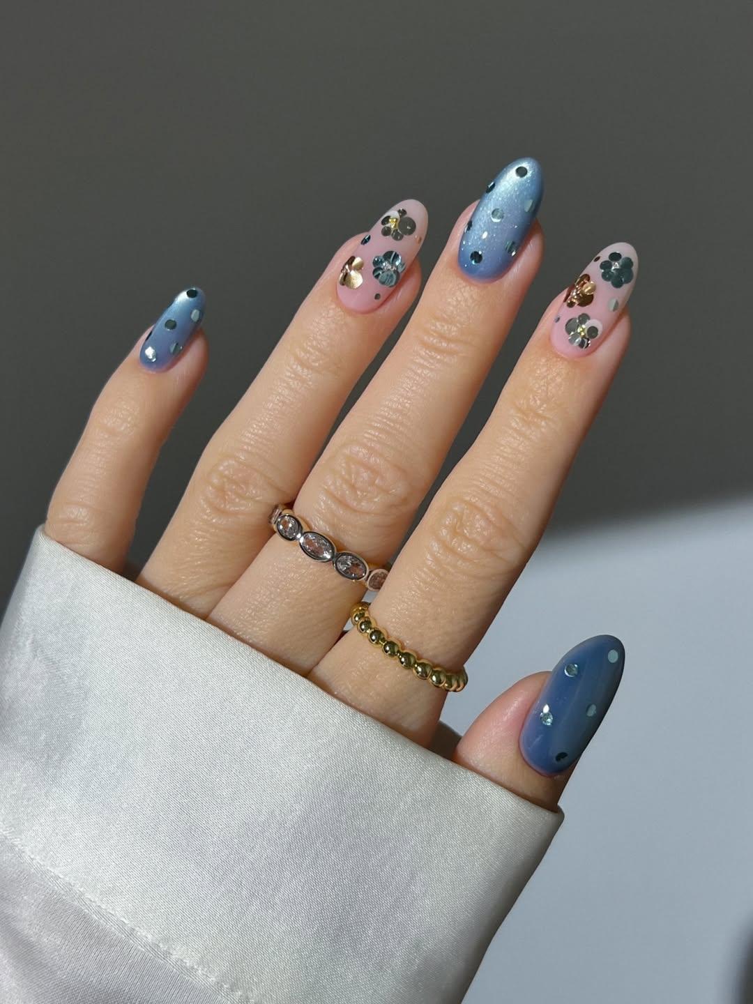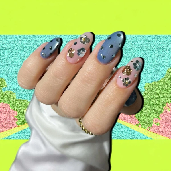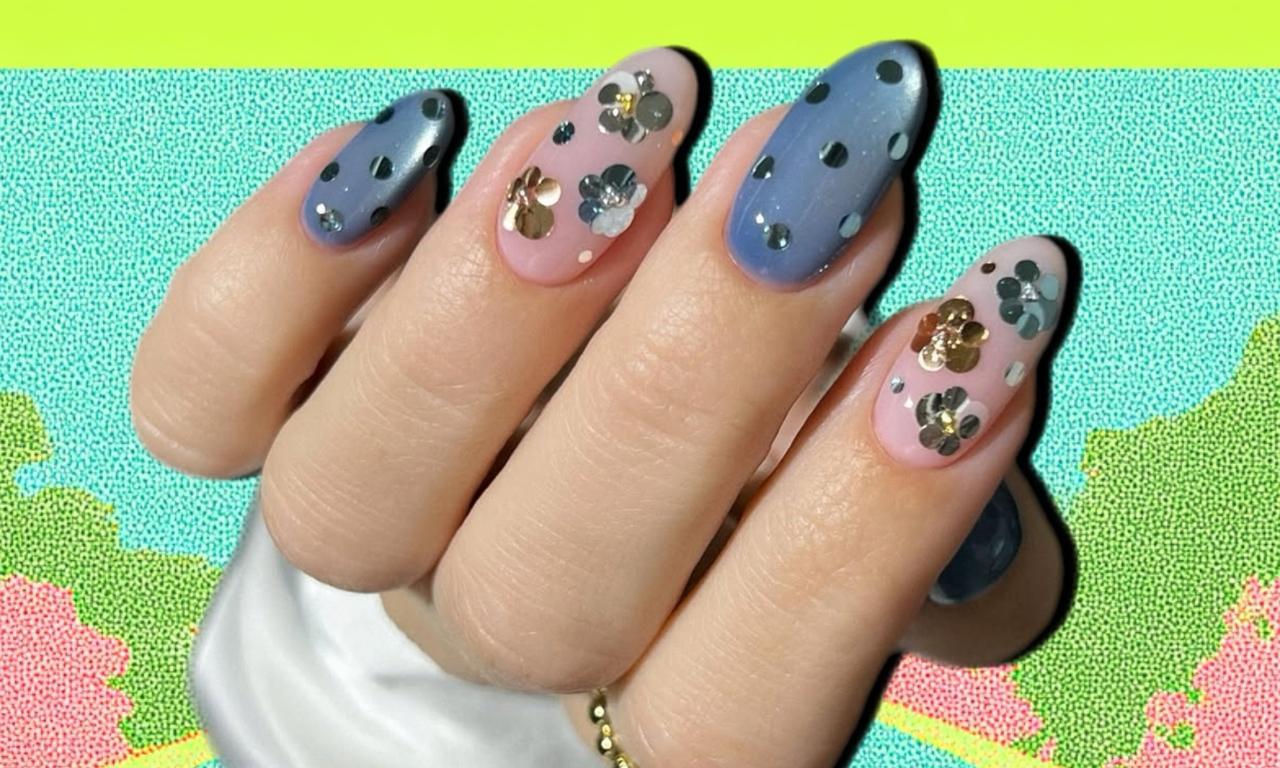 Весной всегда хочется чего-то чуть более игривого, чем привычный нюд. Но желательно без ощущения, что на ногтях слишком много всего. Сложный маникюр делать и долго, и дорого (если ты ходишь в салон). Идеальный компромисс в таком случае — голубой маникюр с горошком и цветами.