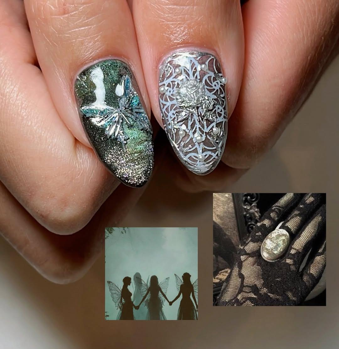 В этом маникюре готика встречается с мистикой. Многослойные блестящие базы в природных оттенках и сложные узоры очень красиво сочетаются с цветочными мотивами. Такой маникюр выглядит почти сказочно. Кажется, его могла бы носить настоящая лесная фея.