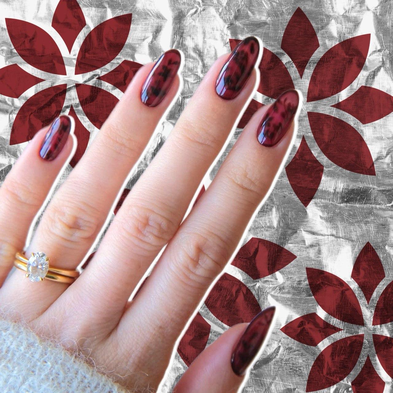 Вместо базы тут полупрозрачный бордовый лак, а рисунок выполнен плотным винным цветом. Чтобы создать эффект глубины, советую поверх цветочков нанести еще один слой лака, который ты использовала для фона. Такой маникюр выглядит особенно элегантно, а еще он понравится тем, кто не любит черный оттенок на ногтях.