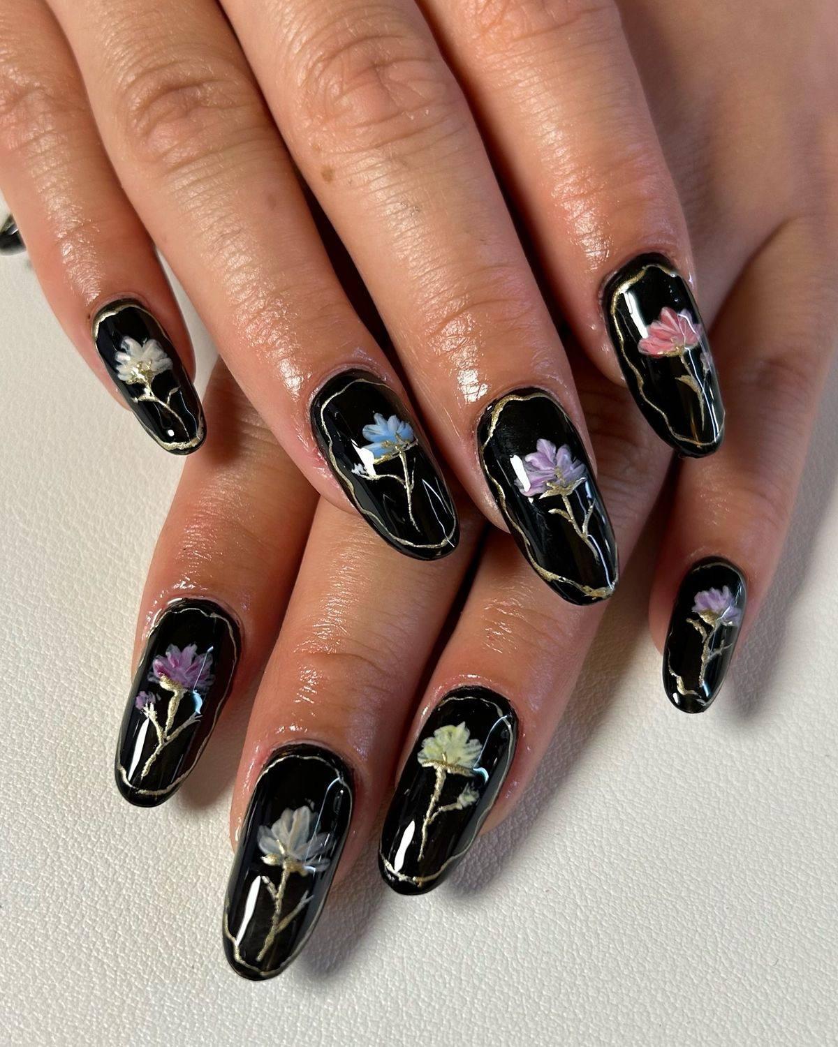 Неожиданный, но очень актуальный контраст — это темная база с пастельными цветочками. Лавандовые, салатовые, голубые и розовые рисунки очень красиво выглядят на черном плотном лаке. Это идеальный баланс между готикой и романтикой, который делает этот маникюр особенным. А если добавишь золотистую рамку, получится еще более воздушный дизайн.