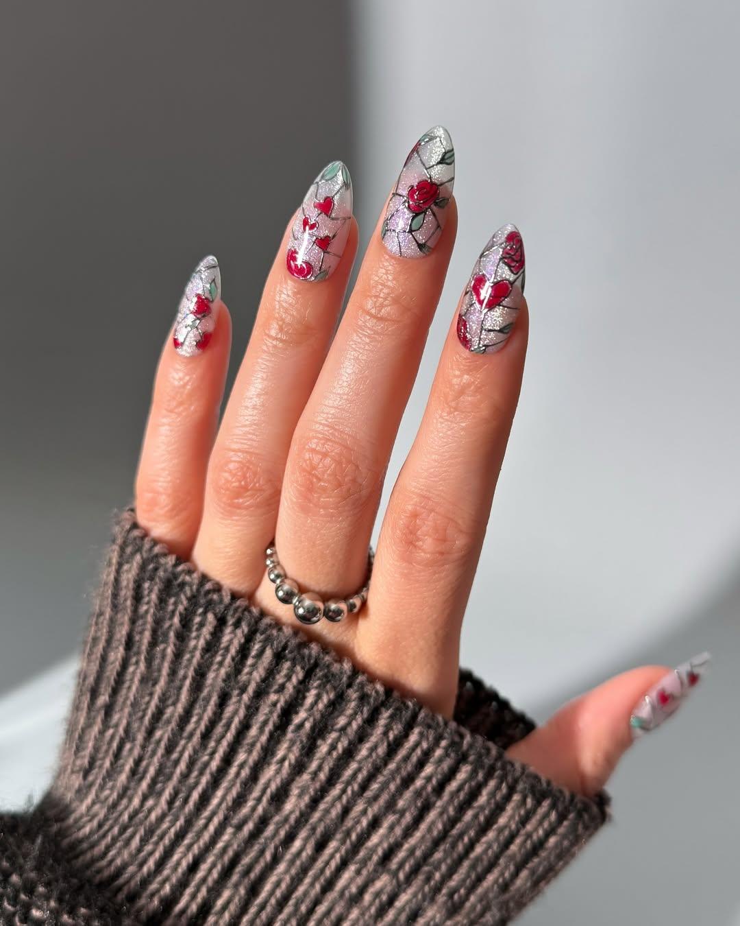 А вот и самый светлый и нежный вариант в подборке. Полупрозрачная база с серебристым шиммером и цветы с сердечками, оформленные в витражной технике, смотрятся свежо. Если хочется попробовать готику, но ты не любишь темные лаки, то этот вариант может стать твоим любимчиком.