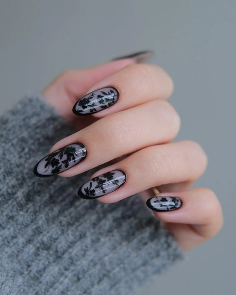 Это отправная точка для тех, кто хочет попробовать тренд на цветочную готику, но не готов к экспериментам. Полупрозрачная черная база в этом дизайне служит фоном для тонких цветочных рисунков. А рамка по контуру ногтя добавляет графичности и отсылает к винтажным иллюстрациям и старинным медальонам.