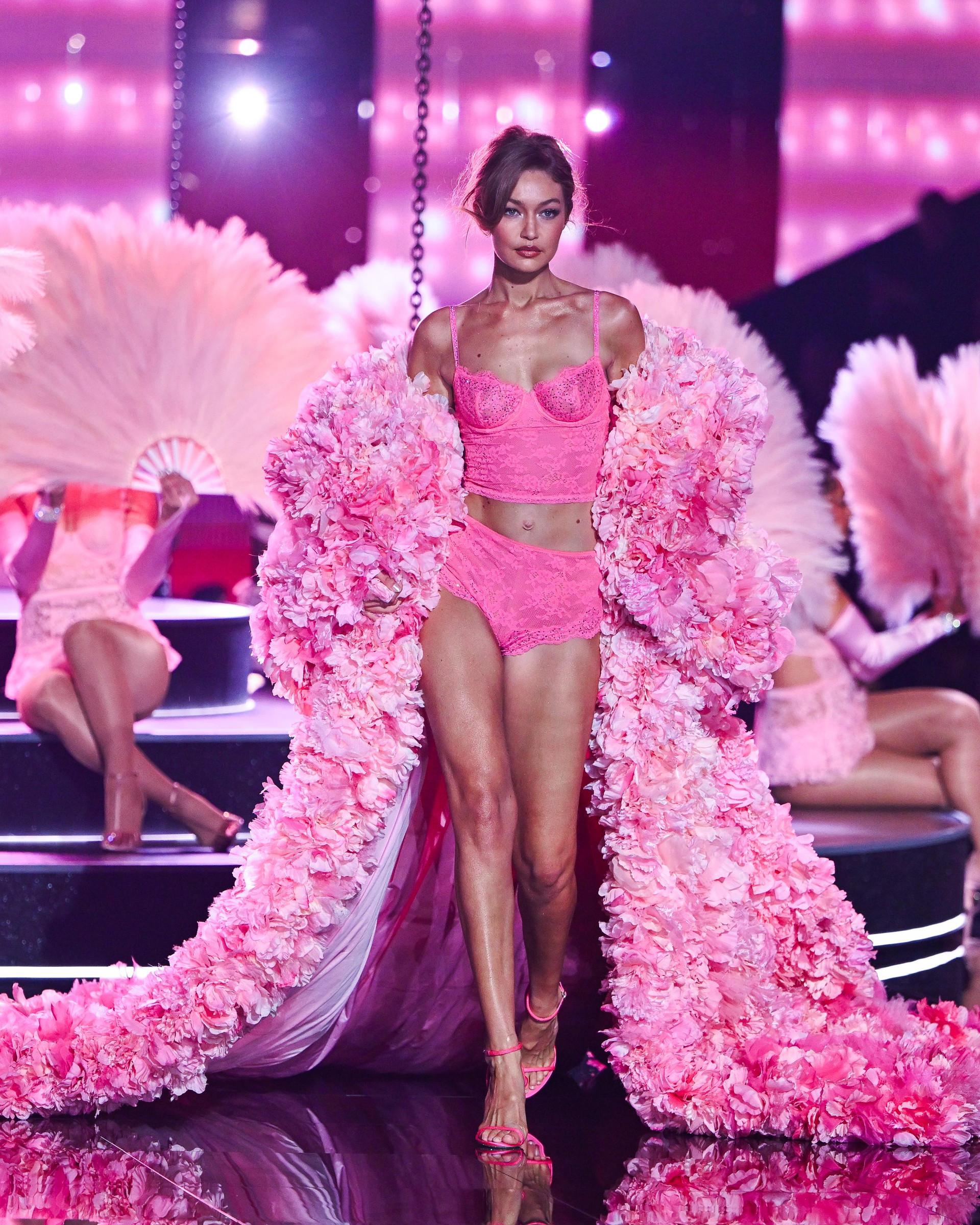 Белла Хадид вышла на подиум дважды. Один из ее луков — эффектное красное нижнее белье. Такой яркий цвет красиво сочетался с золотистой кожей Беллы и ее новым цветом волос. Второй образ звезды — серебряный комплект с висящими на нем украшениями и белые крылья. Некоторые зрители отметили, что модели, недавно выписавшейся из больницы из-за обострения хронической болезни, было тяжеловато идти с таким массивным декором за плечами.