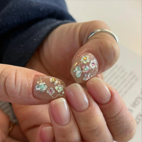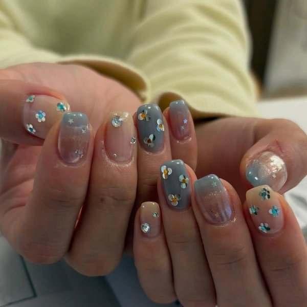 Теперь самое интересное. Тебе понадобятся стразы разных цветов: белые, голубые, розовые, желтые, персиковые, фиолетовые. А отдельно — маленькие серебристые для серединок. Работай по принципу цветка: сначала закрепи центральную стразу, а затем вокруг нее выложи лепестки. Обычно это 4-6 камушков.