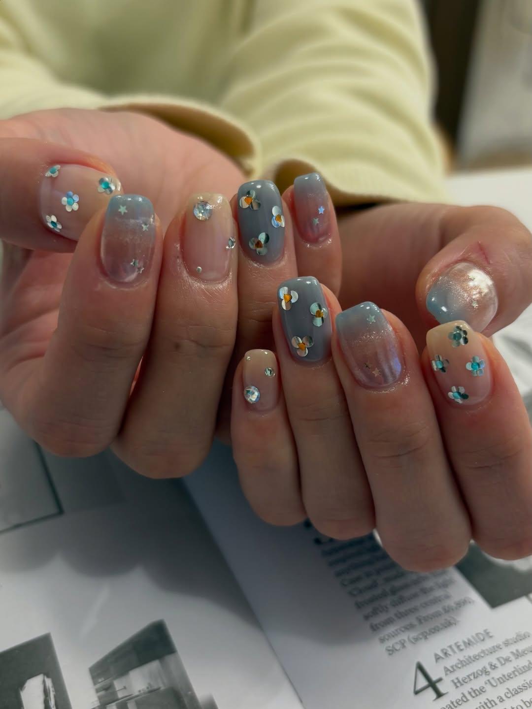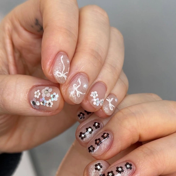 Кайли позаимствовала этот тренд маникюра у японок и кореянок. Этой весной азиатки просто влюбились в простые нейл-арты из цветов, выложенных чем-то блестящим. Если Дженнер использует стразы, то они выбирают кусочки крупного глиттера. Такой маникюр смотрится чуть более деликатно, а еще он очень прост в исполнении, потому что такие блестяшки не нужно приклеивать каким-то особенным способом. Но и стразы, и глиттер смотрятся одинаково классно. Выбирай тот вариант, который тебе больше по душе!