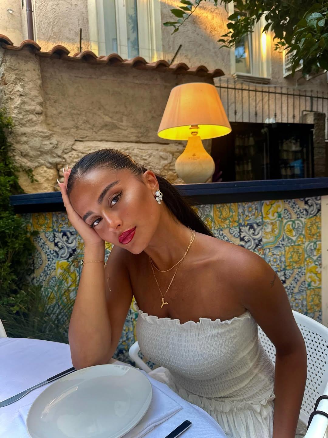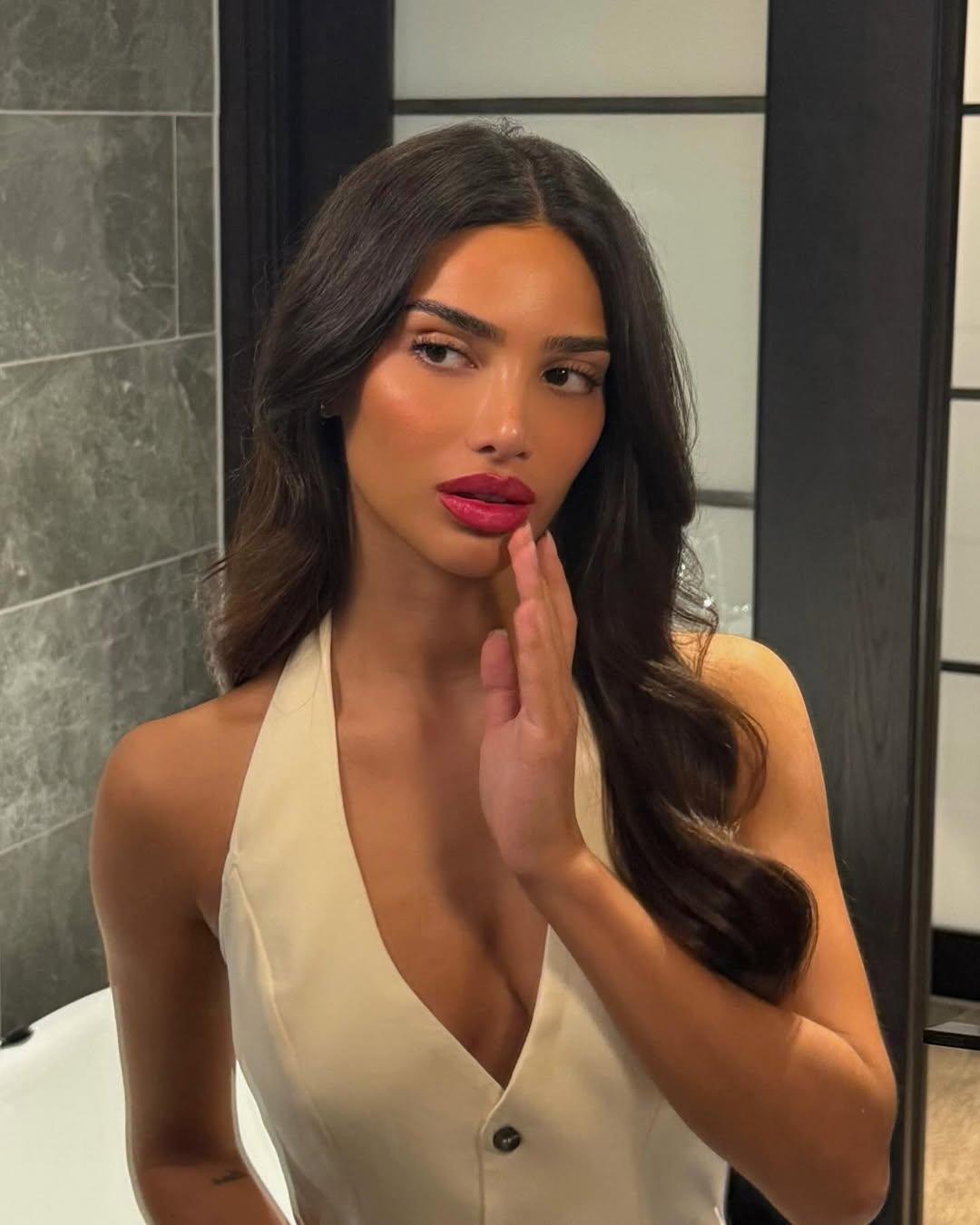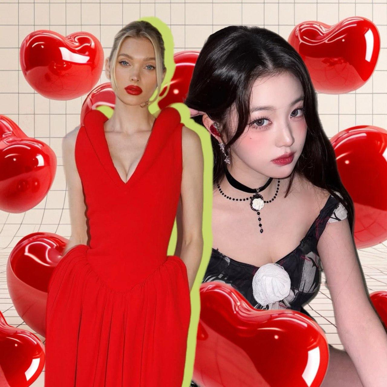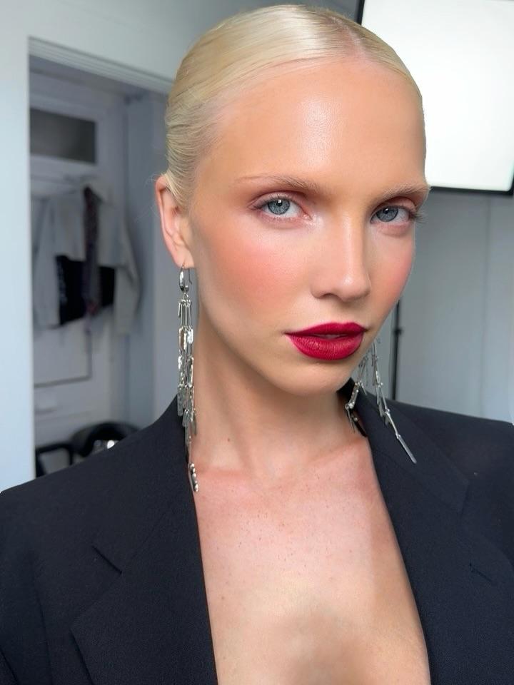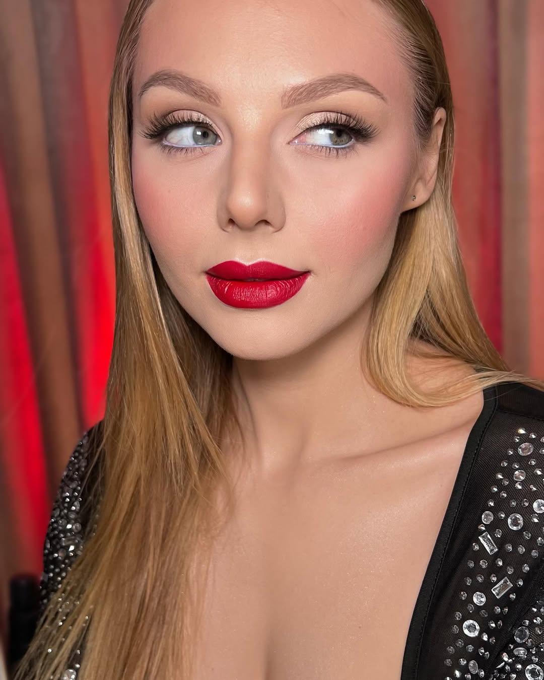 Сочетать яркие губы можно не только с другими деталями макияжа, но и с одеждой. Особенно круто смотрятся наряды в тон. С красной помадой прекрасно выглядят алые, бордовые, вишневые платья. Один из таких луков можешь подглядеть у Эльзы Хоск. Она скомбинировала губы и наряд в одном цвете с прической с пучком и красивыми длинными ресницами.