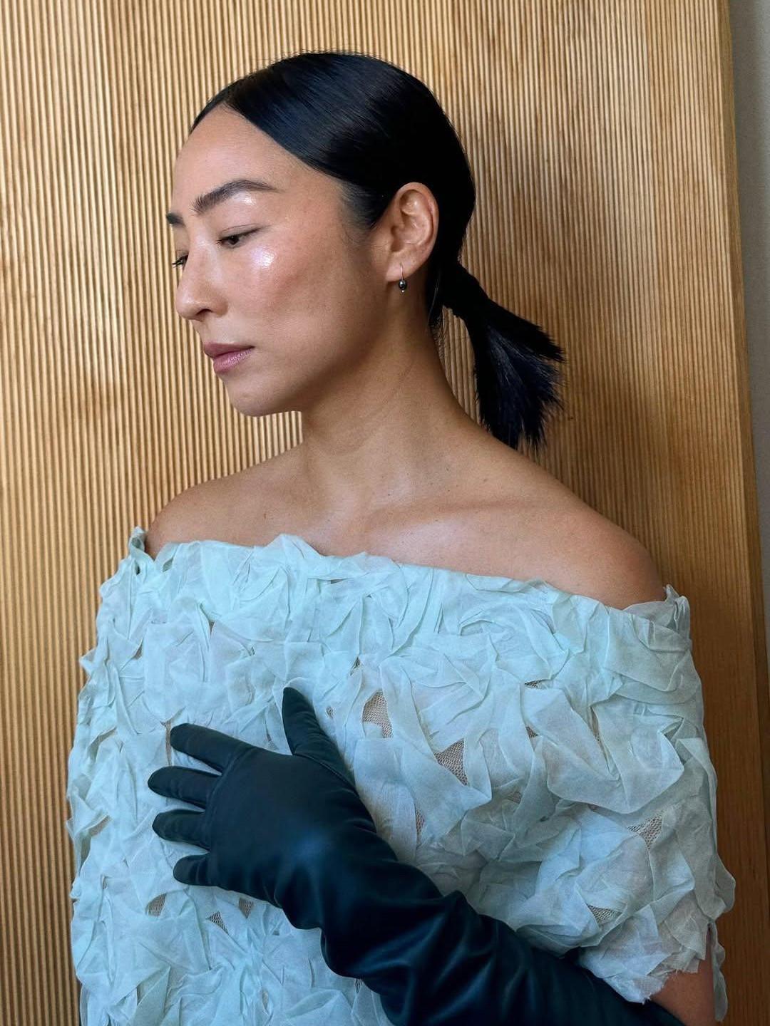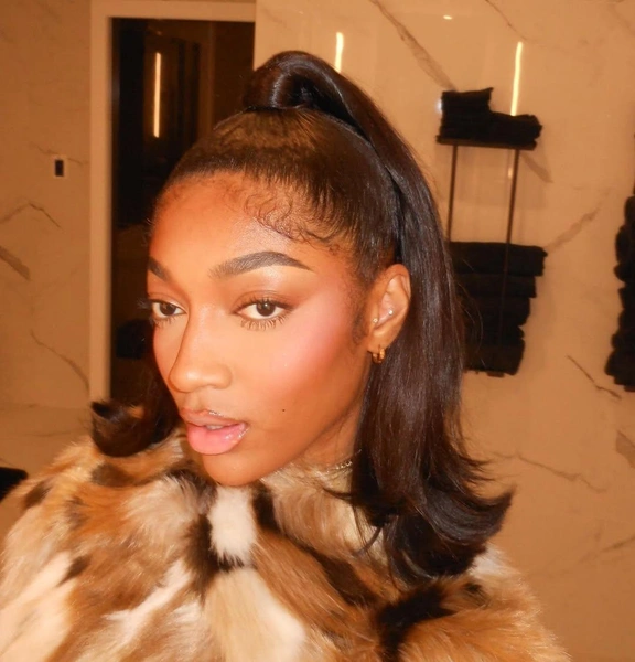 Ровный пробор посередине создает симметрию и структуру, а небрежность хвостика добавляет баланс этой прическе, не давая образу быть слишком серьезным. Если хочешь ее повторить, сделай идеально ровный пробор посередине. Используй тонкий конец расчески для точности. Зачеши волосы назад и не затягивай слишком туго — хвост должен сидеть свободно. Несколько коротких прядей у лица могут выбиться — это нормально и добавляет современности.