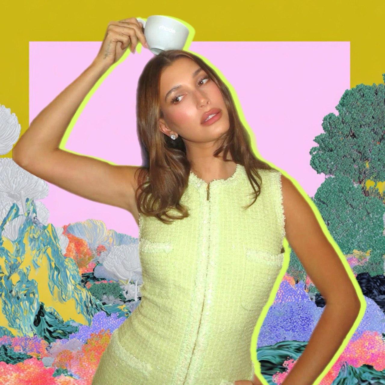 Такой светлый и легкий макияж Хейли решила сочетать с лимонно-салатовым костюмом из твида из юбки и топа без рукавов. Цвет освежает лицо, а ткань делает одеяние более нарядным. Костюм Бибер выглядит женственно, но при этом не требует акцентных аксессуаров. Хейли лишь ограничилась кольцом с крупным камнем сережками-гвоздиками.