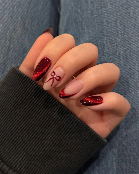 Пора воплощать свои желания в реальность: если ты уже спишь и видишь подарок у себя под елкой, почему бы не визуализировать его дизайне маникюра? Предлагаю тебе добавить небольшую акцентную деталь — красный бантик, будто с желанной коробочки. Помимо него еще большей яркости можно достичь с помощью трендового «кошачьего глаза»: осталось лишь обзавестись специальным магнитом или обратиться к своему мастеру, чтобы избежать ошибок.