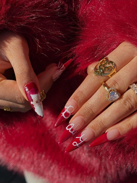 С этим дизайном лучше обратиться к нейл-мастеру: будет достаточно сложно повторить рисунок Санты на большом пальце. С френчем будет просто: с такой длиной можно не страшно ошибиться, подкорректировать тонкие линии линии тебе не составит труда. Добавь крупные буквы и, вперед, сиять!