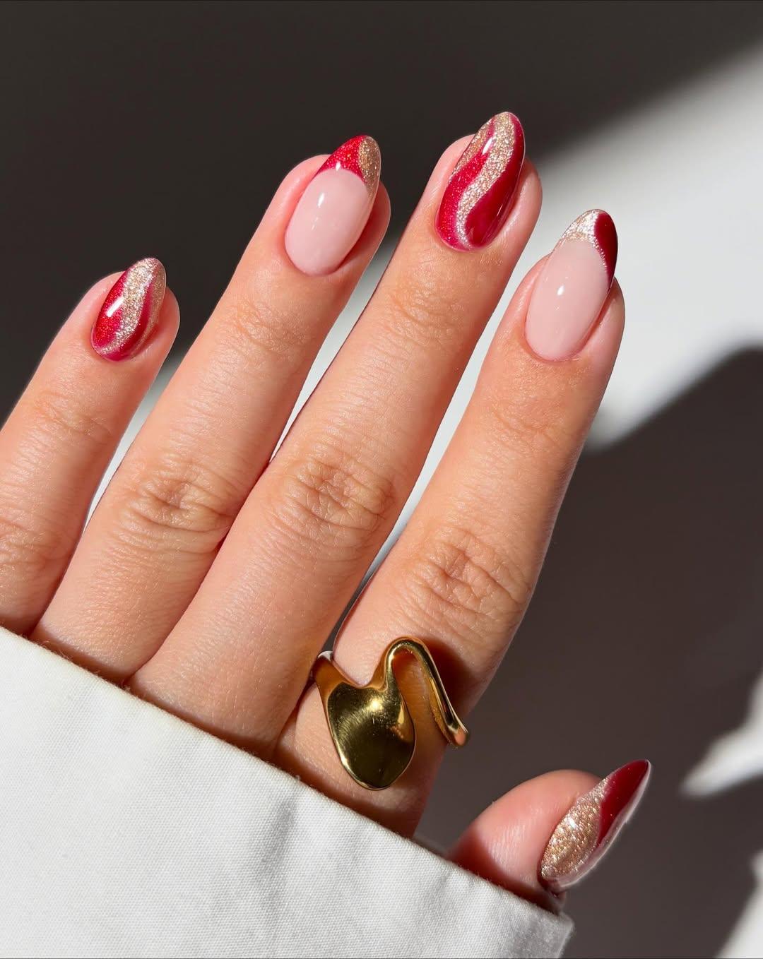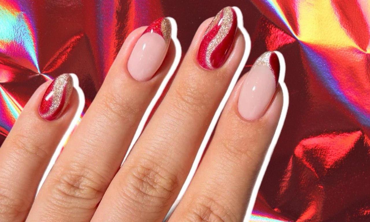 Красный и золотой — главные цвета этого Нового года. Красная огненная лошадка точно бы оценила твой маникюр с такими акцентами: как минимум, она точно предоставит тебе удачу и везение в следующем году. Здесь все очень просто: рисуй плавные линии двумя оттенками по очереди, но будь аккуратна, чтобы не смешать их между собой. Идеальный праздничный маникюр готов к вечеринке!