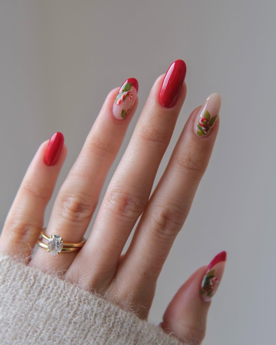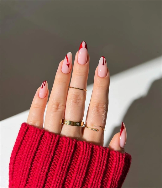 Иногда душа так и просит жуткого драматизма, тем более, после выхода фильма «Франкенштейн». Его можно добавить с помощью маникюра с готическими акцентами, которые не отталкивают, а цепляют взгляд. В качестве базы выбери розово-нюдовый оттенок — он самый минималистичный. Детали можно прорисовать с помощью красного блестящего лака: куда же без сияния в Новый год? Главное, быть осторожнее и не дать руке предательски соскользнуть с кисти!