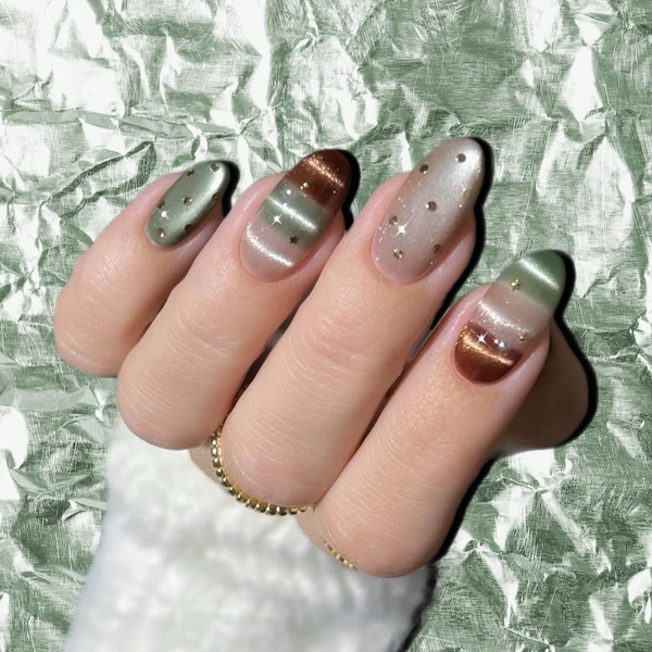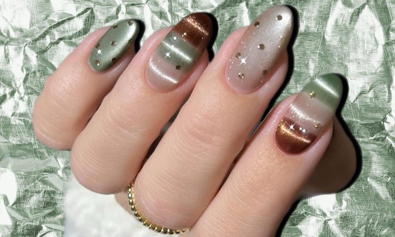 Этот маникюр строится на трех базовых цветах: нюдово-золотистый (теплый бежевый с золотым шиммером), шалфейный и шоколадный. Все три лака имеют эффект «кошачий глаз»: магнитные частицы в составе создают характерную полосу блика, которая смещается при движении руки.