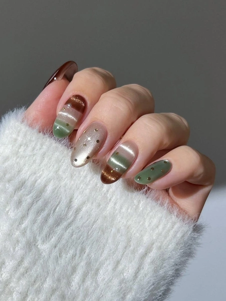 Эта весна изменила это, доказав, что какао и шалфей могут быть не просто красивыми, но и невероятно стильными. С ними круто делать сложные дизайны, в которых комбинируются оттенки, текстуры, декор. Один из самых популярных вариантов — маникюр, который сочетает эффект «кошачий глаз» и полоски.