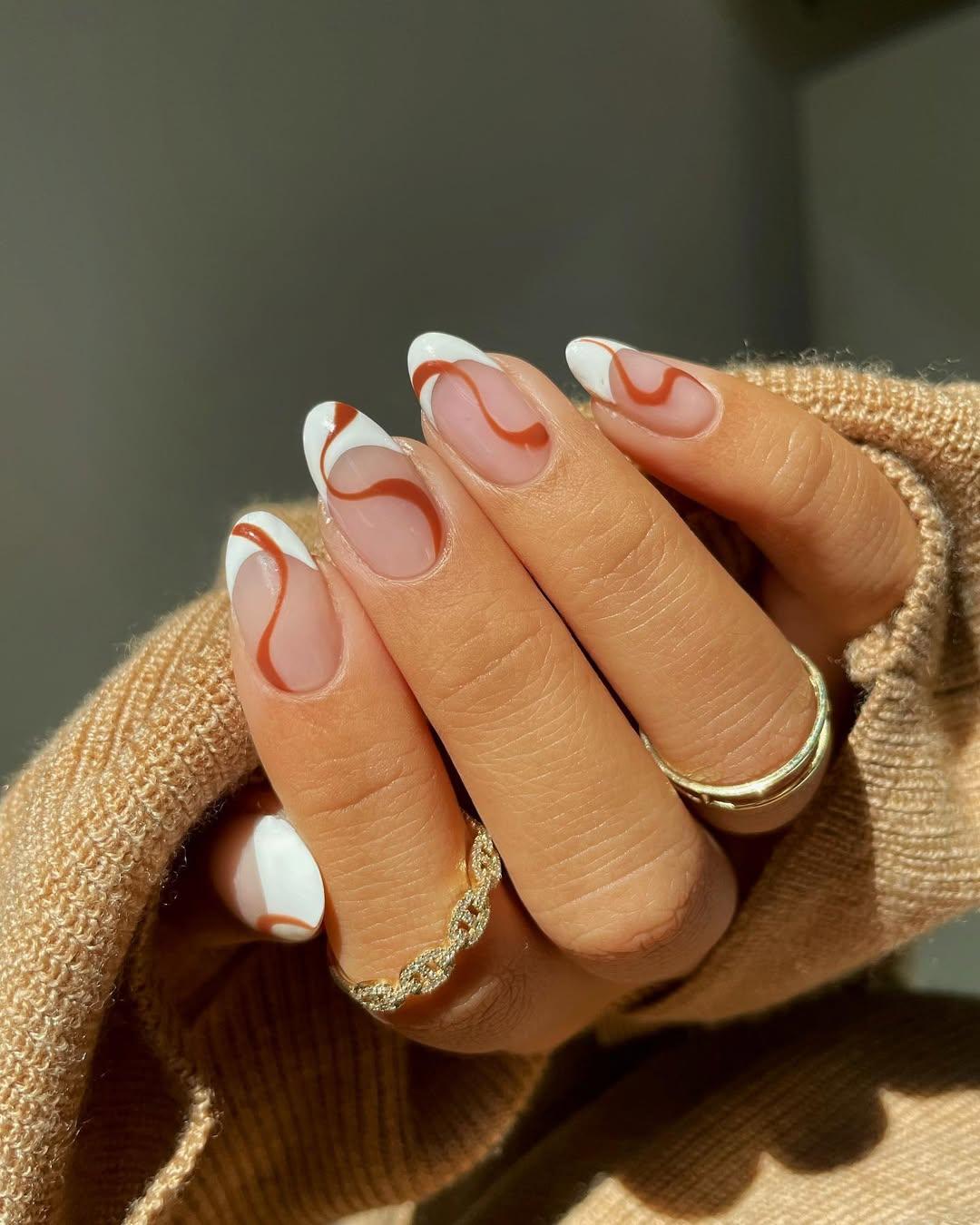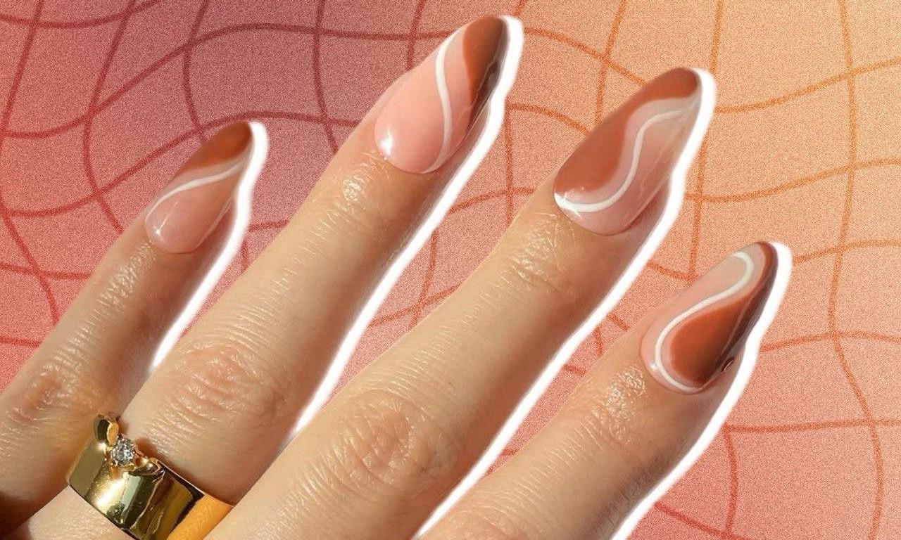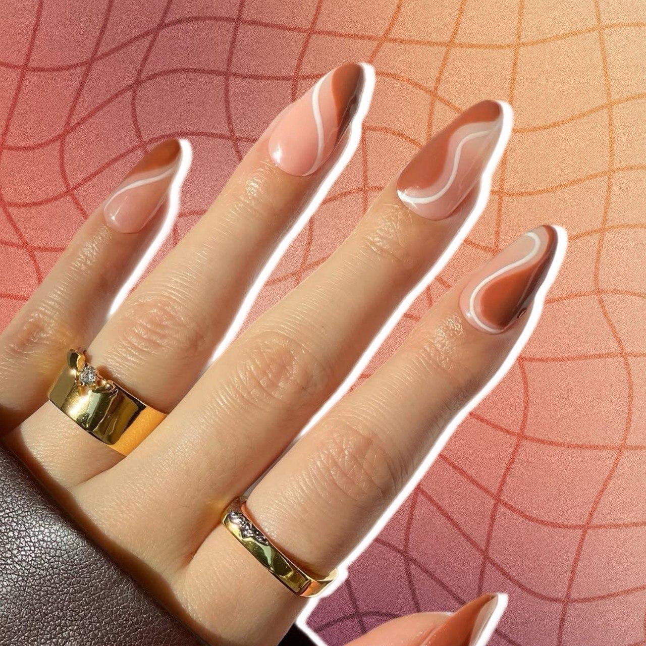 Если тебе френч ближе в теории, а не на практике, то дизайн с волнами станет прекрасным вариантом. Этот дизайн можно сделать с помощью тонких кисточек на молочной базе. Комбинируй белые и карамельные линии разной ширины и формы.