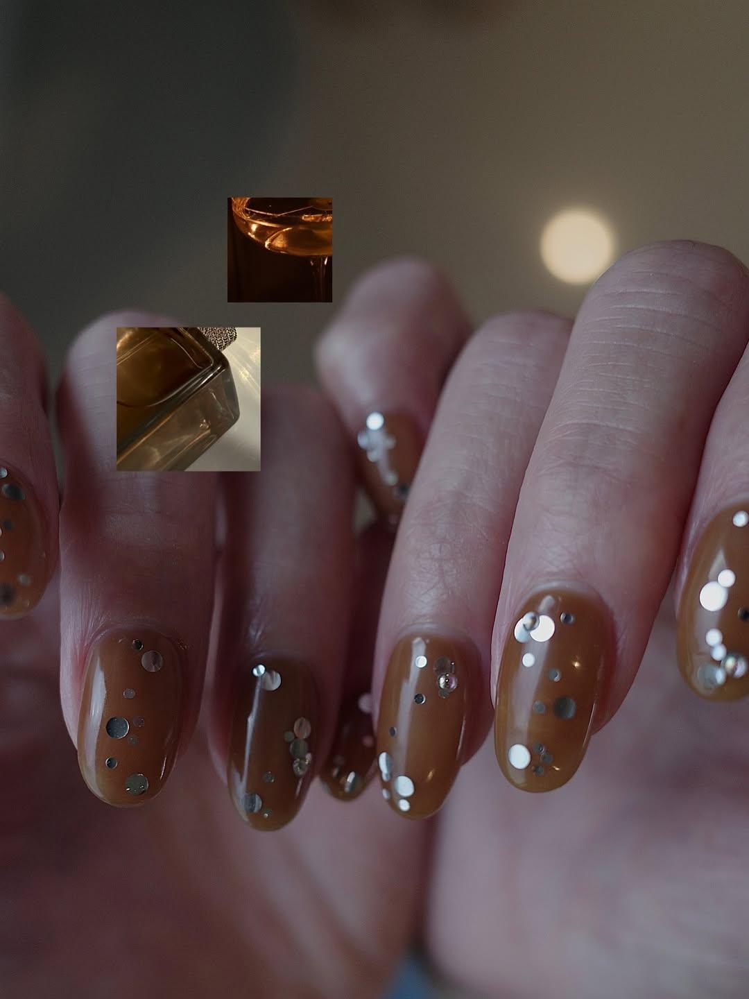 Один из самых эффектных азиатских нейл-трендов можно назвать маникюр с крупным круглым глиттером. Карамельный маникюр можно дополнить блестками серебристого или золотого цвета. Ногти будут выглядеть нарядно, но не слишком ярко.