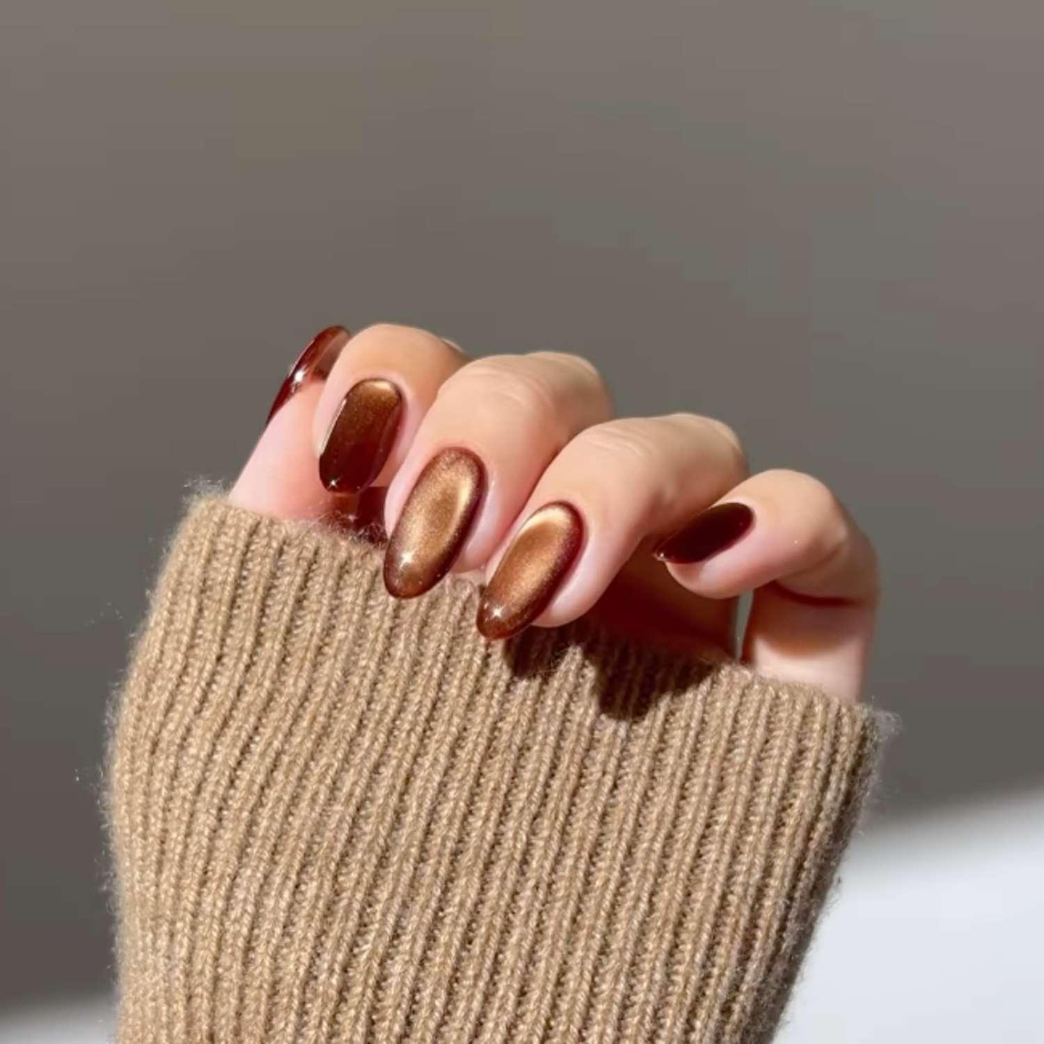Магнитный лак создает красивый бархатистый эффект за счет сочетания блесток и блика. А ногти с покрытием «кошачий глаз» в карамельном цвете выглядят как глазурь из жженого сахара. Этот маникюр прекрасно подойдет для ценительниц «тихой роскоши».
