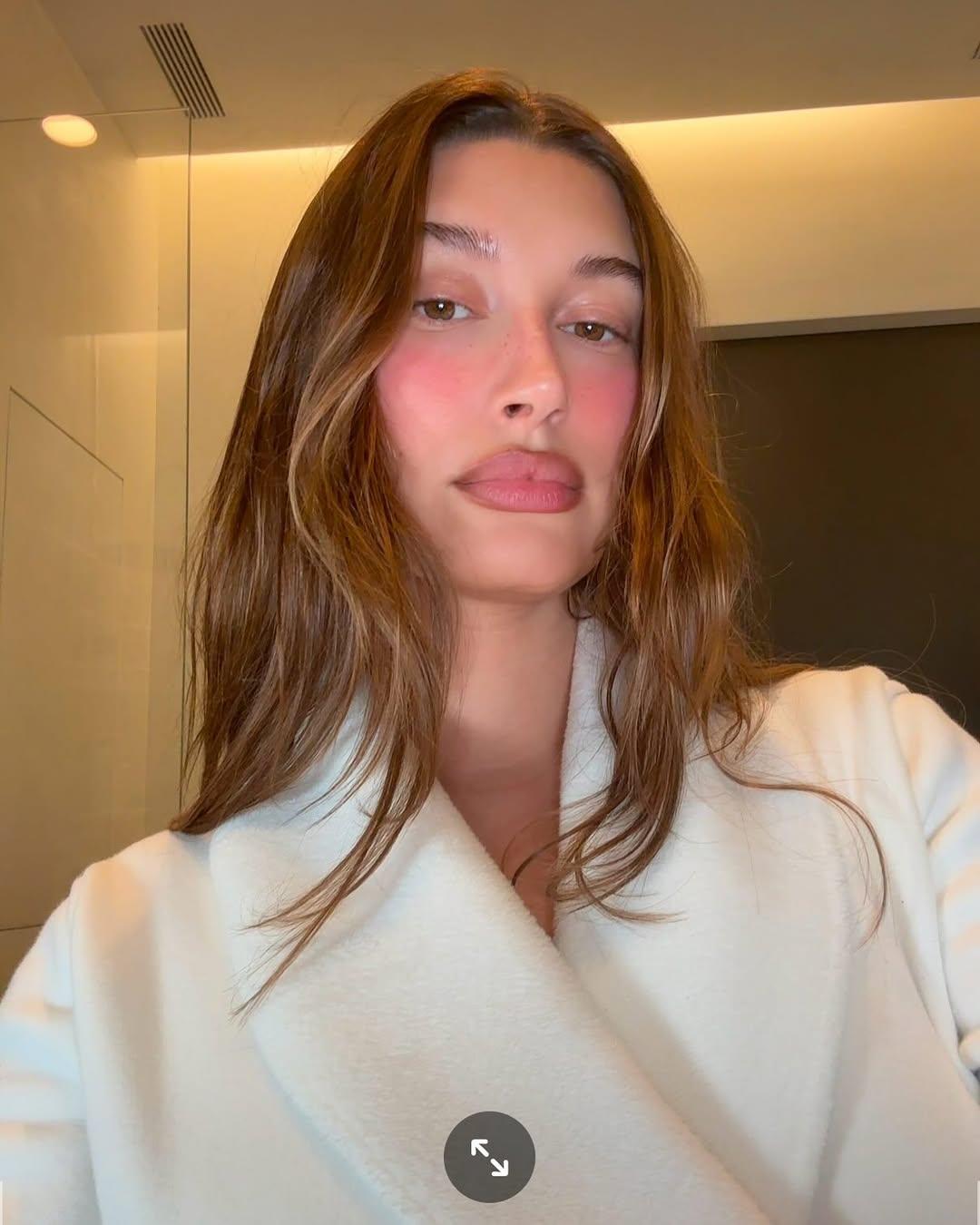 Бибер завершает образ обновлением румян. Она выбрала кремовую текстуру, которая хорошо растушевывается и пальцем, и кистью, а еще натурально выглядит. Так что если твои румяна пропали с лица за рабочий день, то точно обновляй их. Макияж Хейли готов!