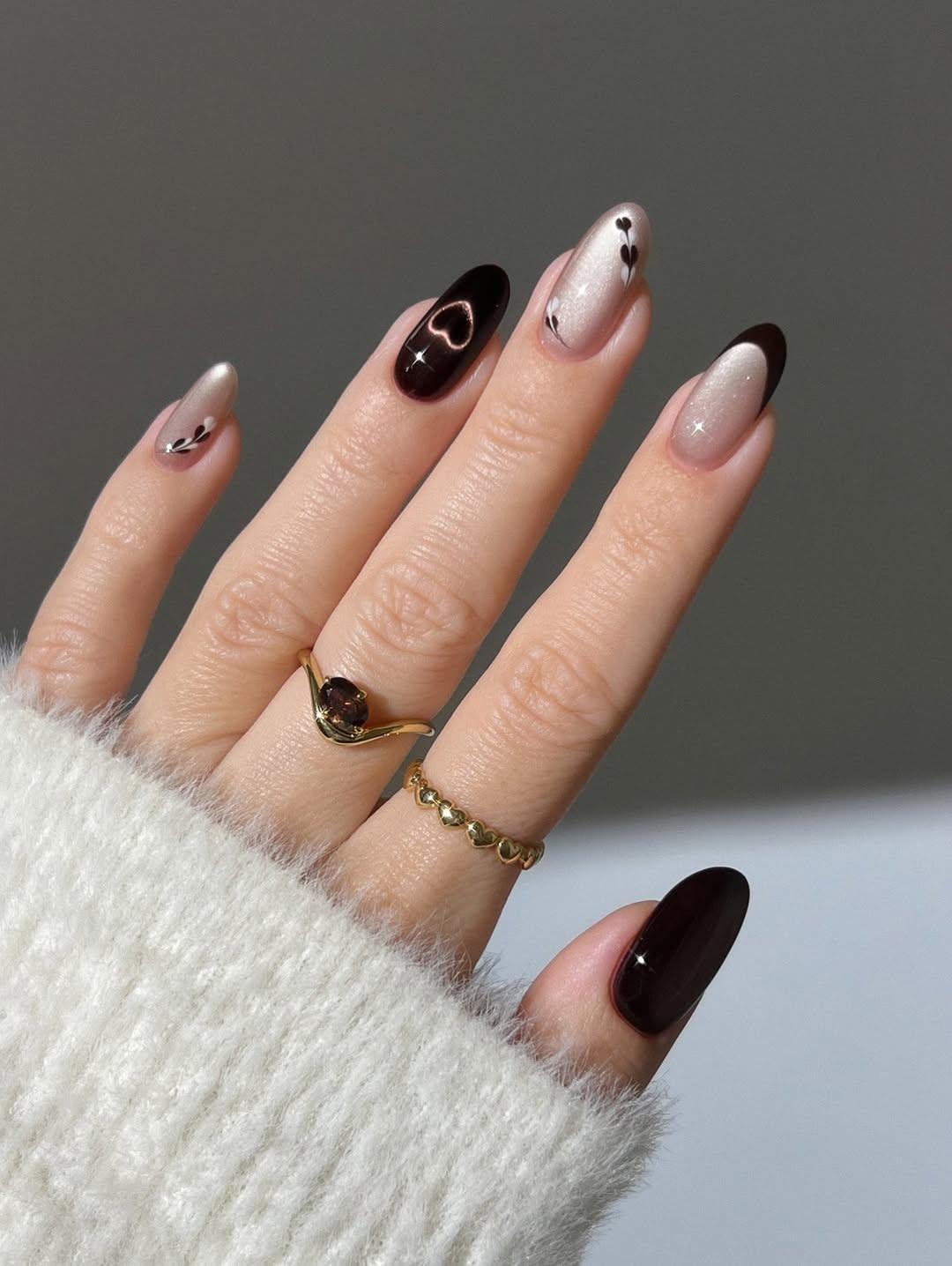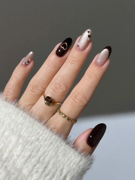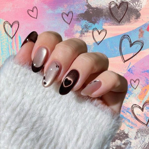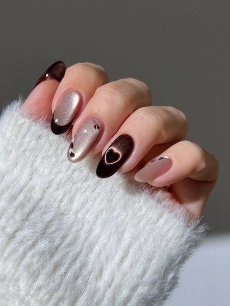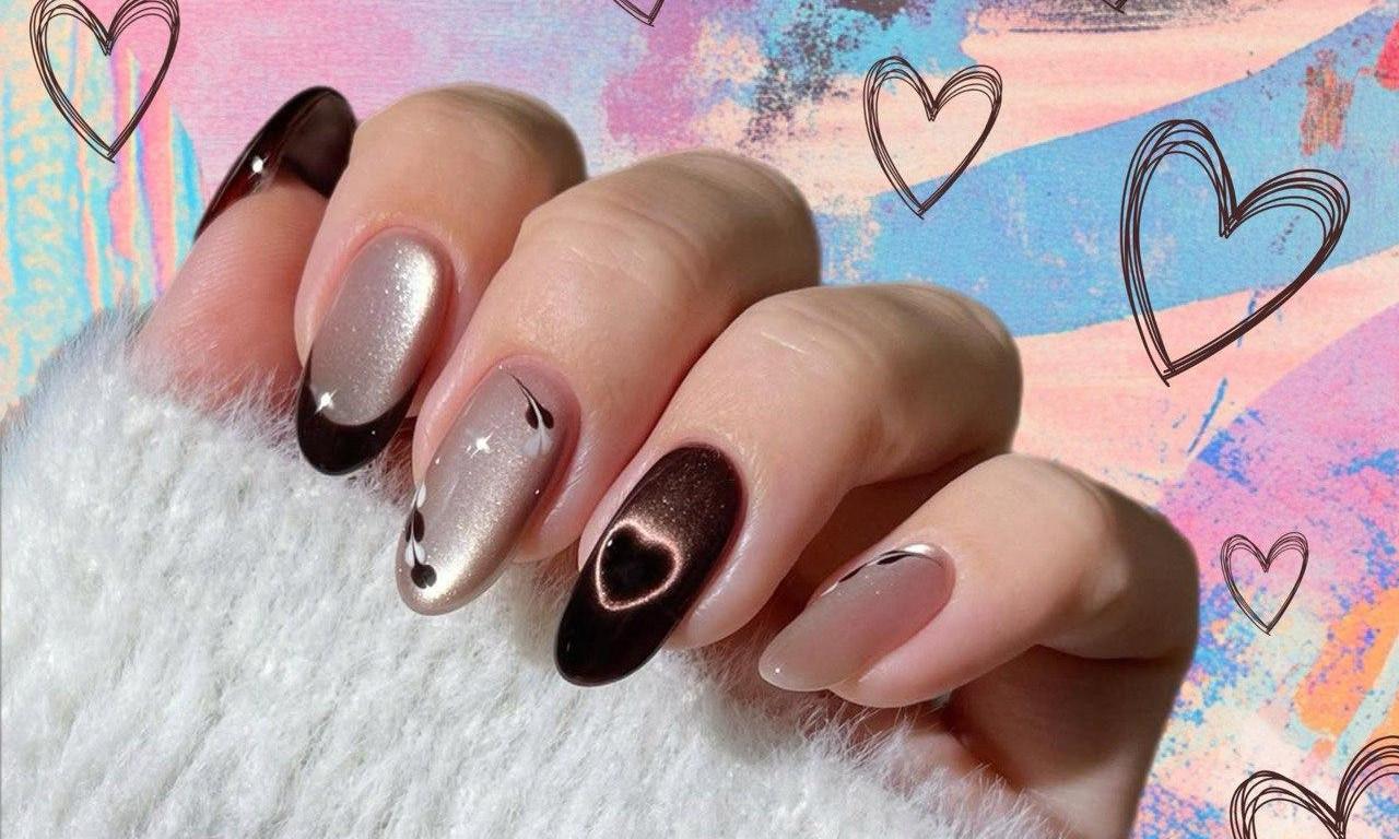 А когда коричневый встречается с романтичными сердечками — получается идеальный баланс между элегантностью и нежностью. Это маникюр для тех, кто хочет романтики, но не готов к розовым бантикам и блесткам. Давай его повторять!