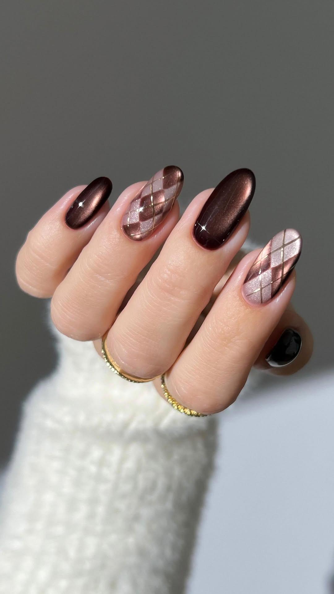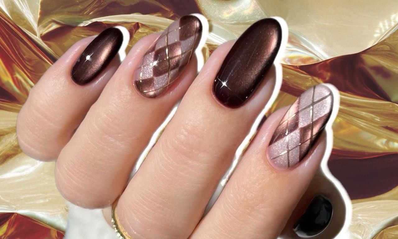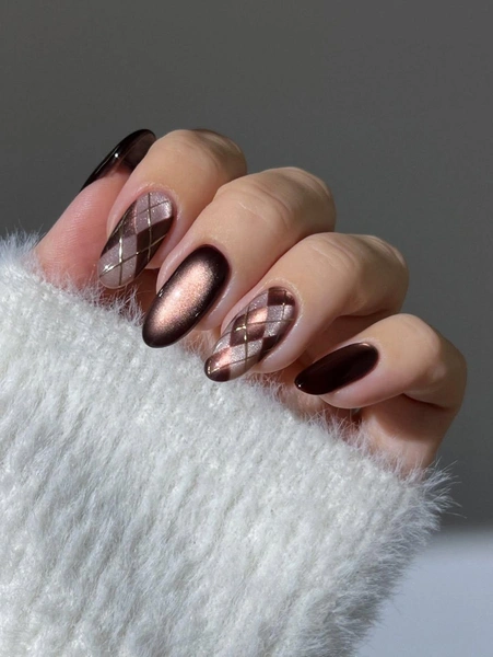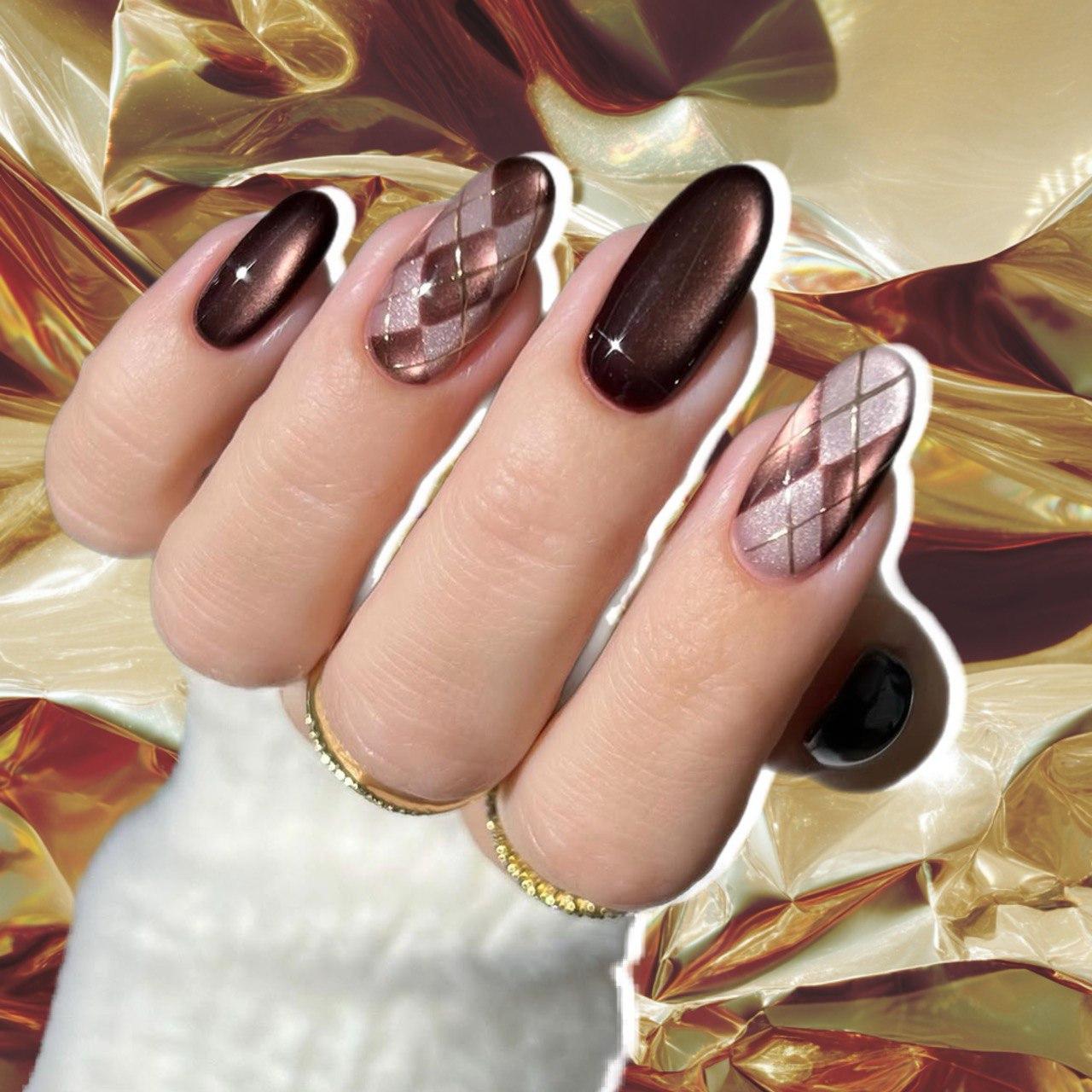 Остальные ногти украшай классической клеткой аргайл. База — светлый нюдово-бежевый лак с эффектом «кошачий глаз». Поверх нарисуй узор коричневым магнитным лаком. Классический аргайл — это ромбы, расположенные по диагонали. В маникюре это может быть пара крупных ромбиков в центре ногтя или несколько маленьких, создающих повторяющийся паттерн. Финальная красивая деталь — золотые линии. Нарисуй их тонкой кистью поверх дизайна. Золото добавляет роскоши и делает дизайн более праздничным.