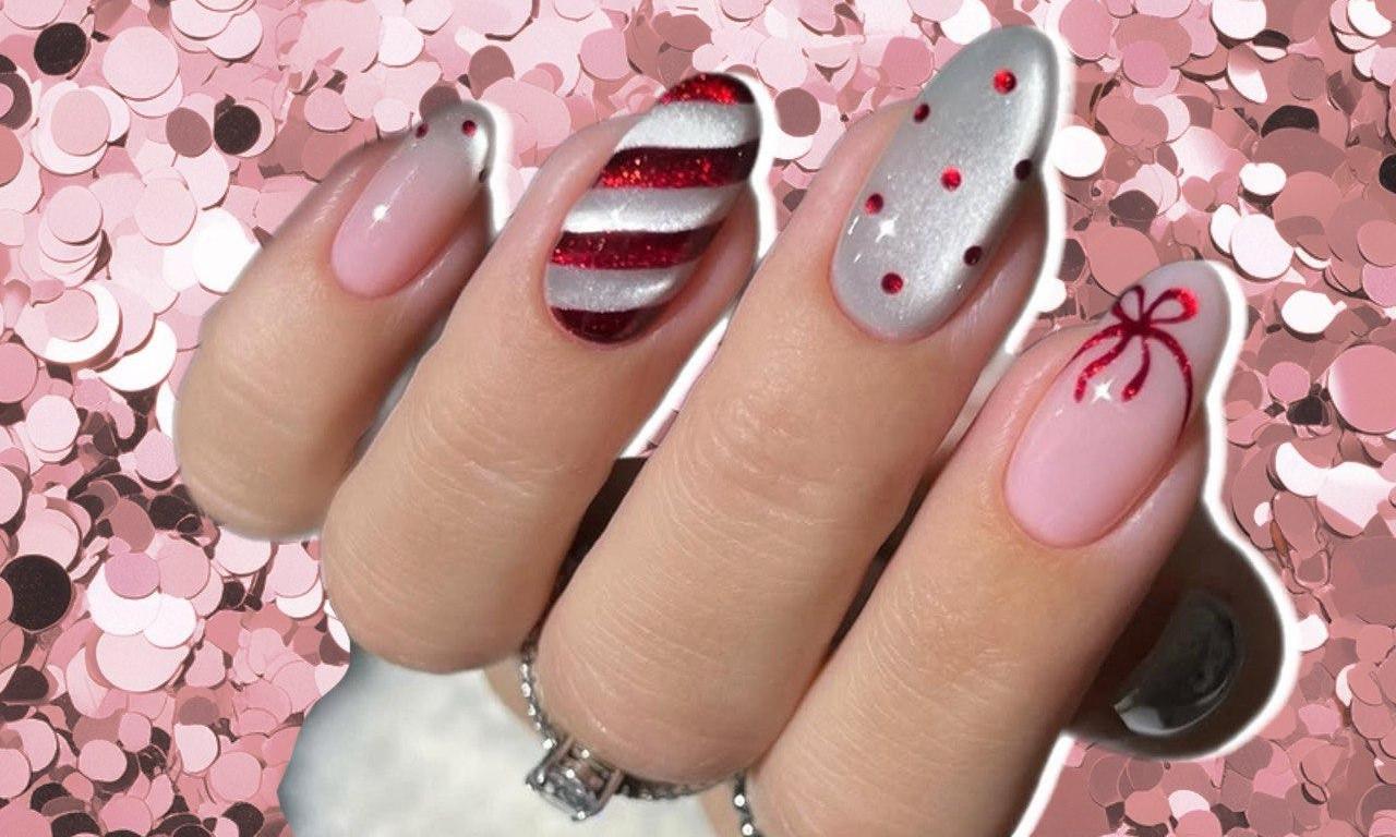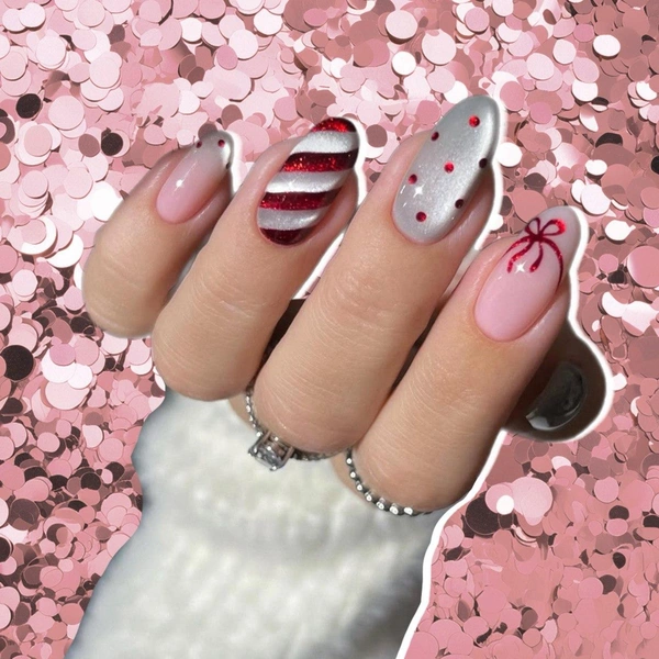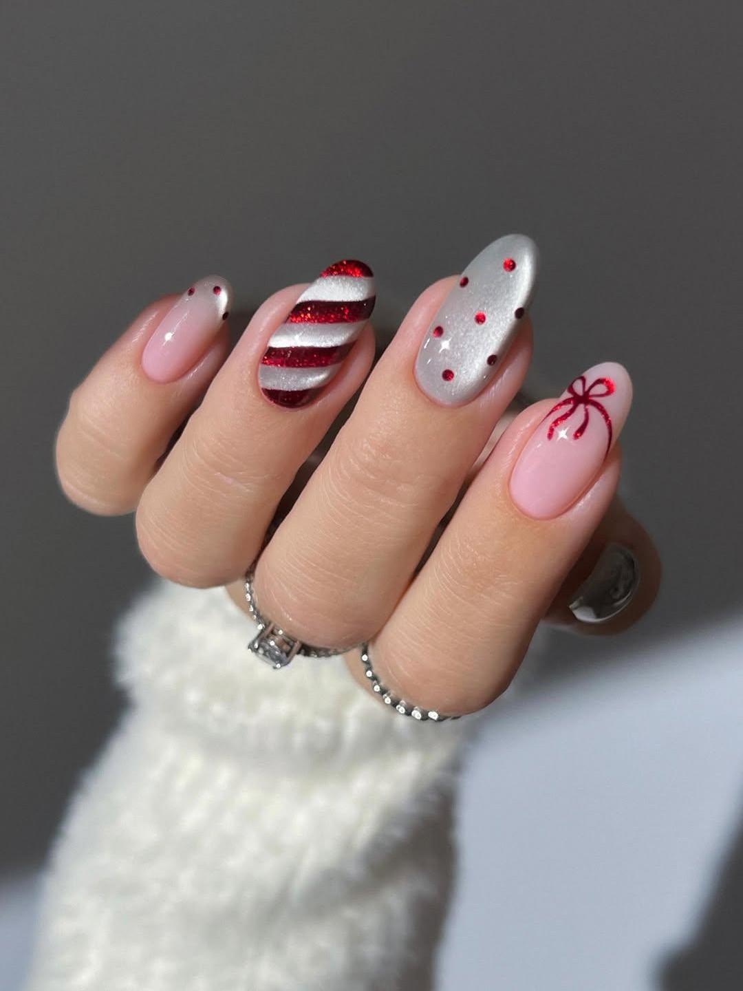 Только сочетать его можно и с другими деталями дизайна: серебряным «кошачьим глазом», конфетными рисунками, принтом в горошек, френчем, бантиками. Кажется, будто этот маникюр был вдохновлен классическим рождественским или новогодним дресс-кодом: праздничный и очень нарядный.