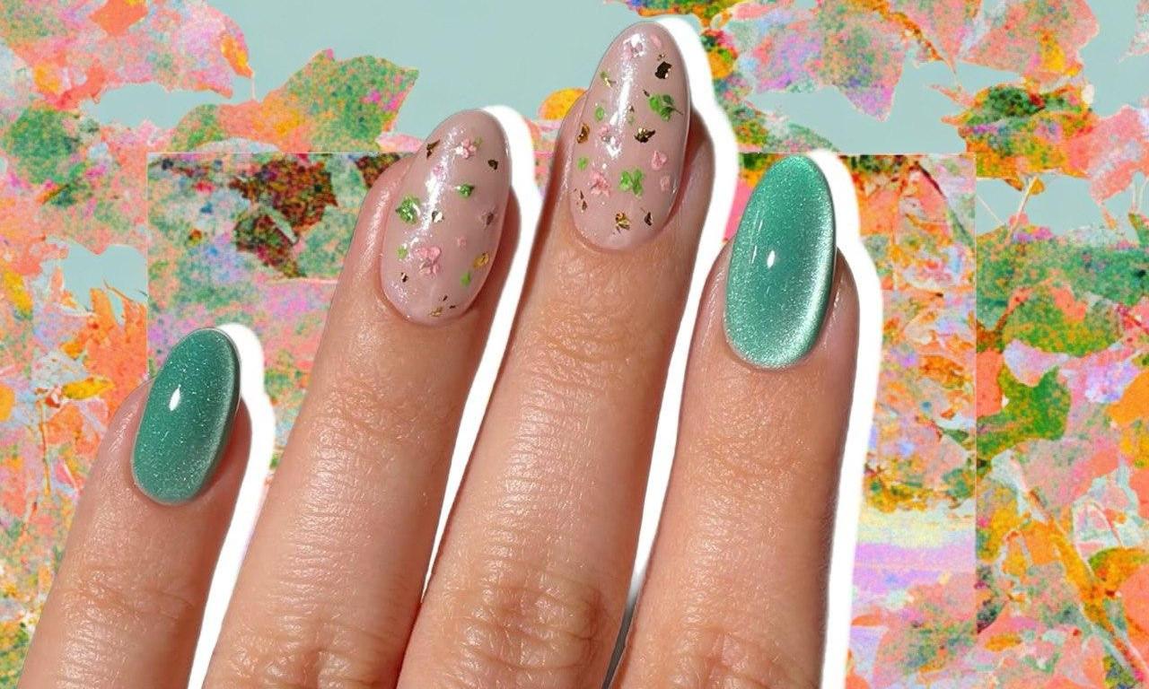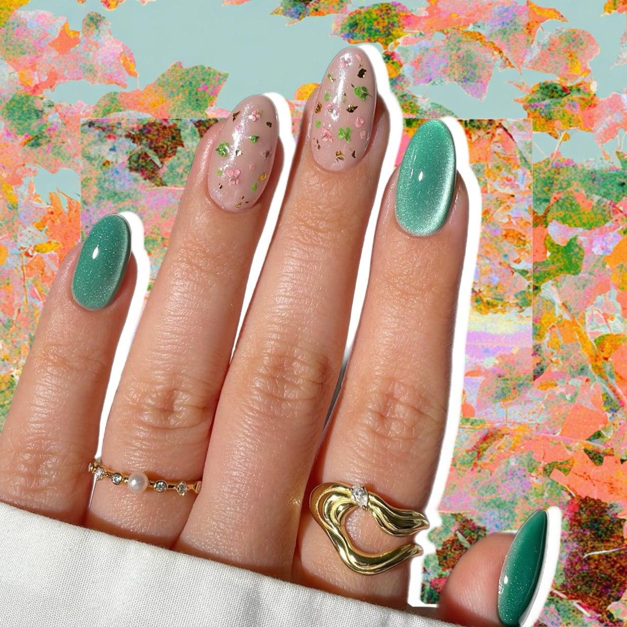 Дальше — самое интересное. На остальные ногти нанеси лак с эффектом «кошачий глаз». Цвет может быть абсолютно любым, но я советую присмотреться к какому-нибудь необычному и сложному оттенку. Например, выбирай мятный или изумрудный. Зеленый цвет будет здорово сочетаться с цветами на остальных пальцах.