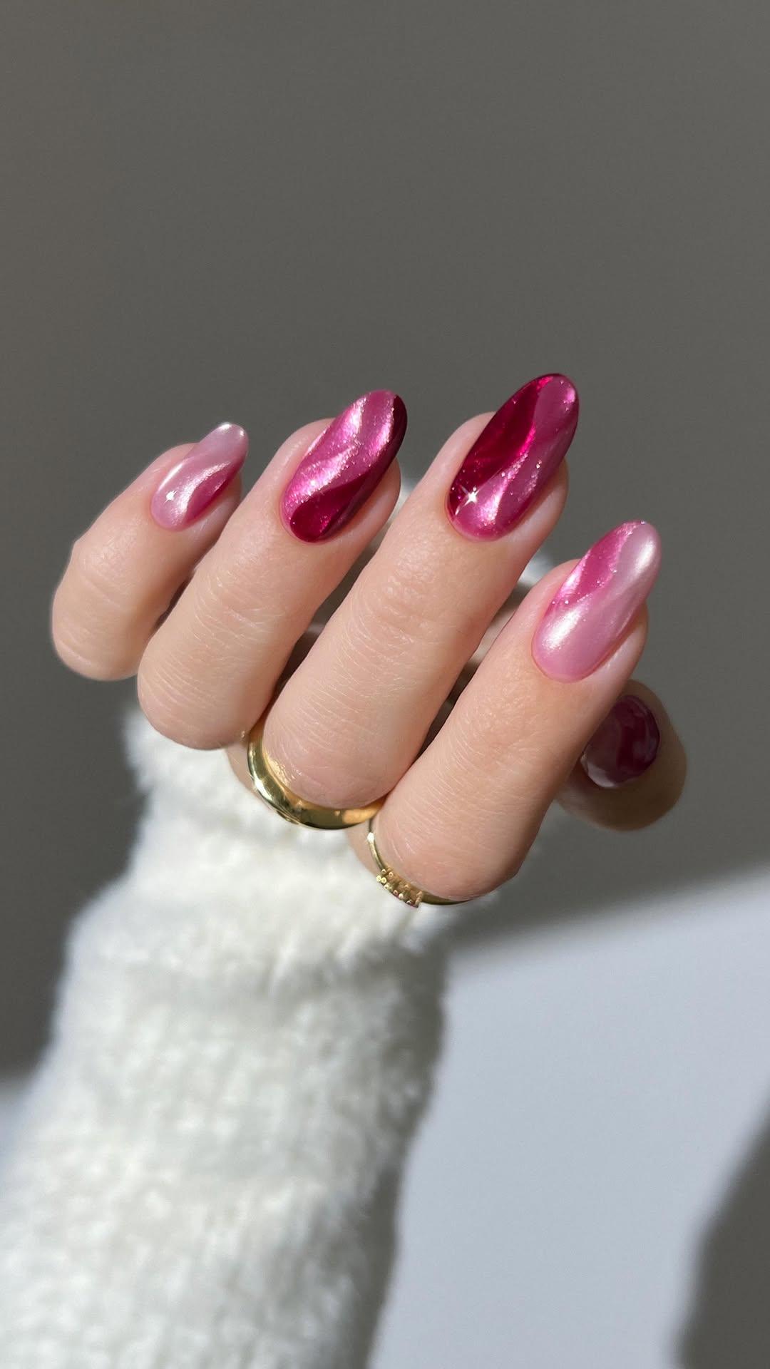 Ключевая идея этого дизайна — волнистые полосы, выполненные в разных оттенках розового. Маникюр строится на плавных линиях, которые словно перетекают друг в друга, создавая эффект движения. Такие полосы напоминают отражение света на шелке или переливы закатного неба.