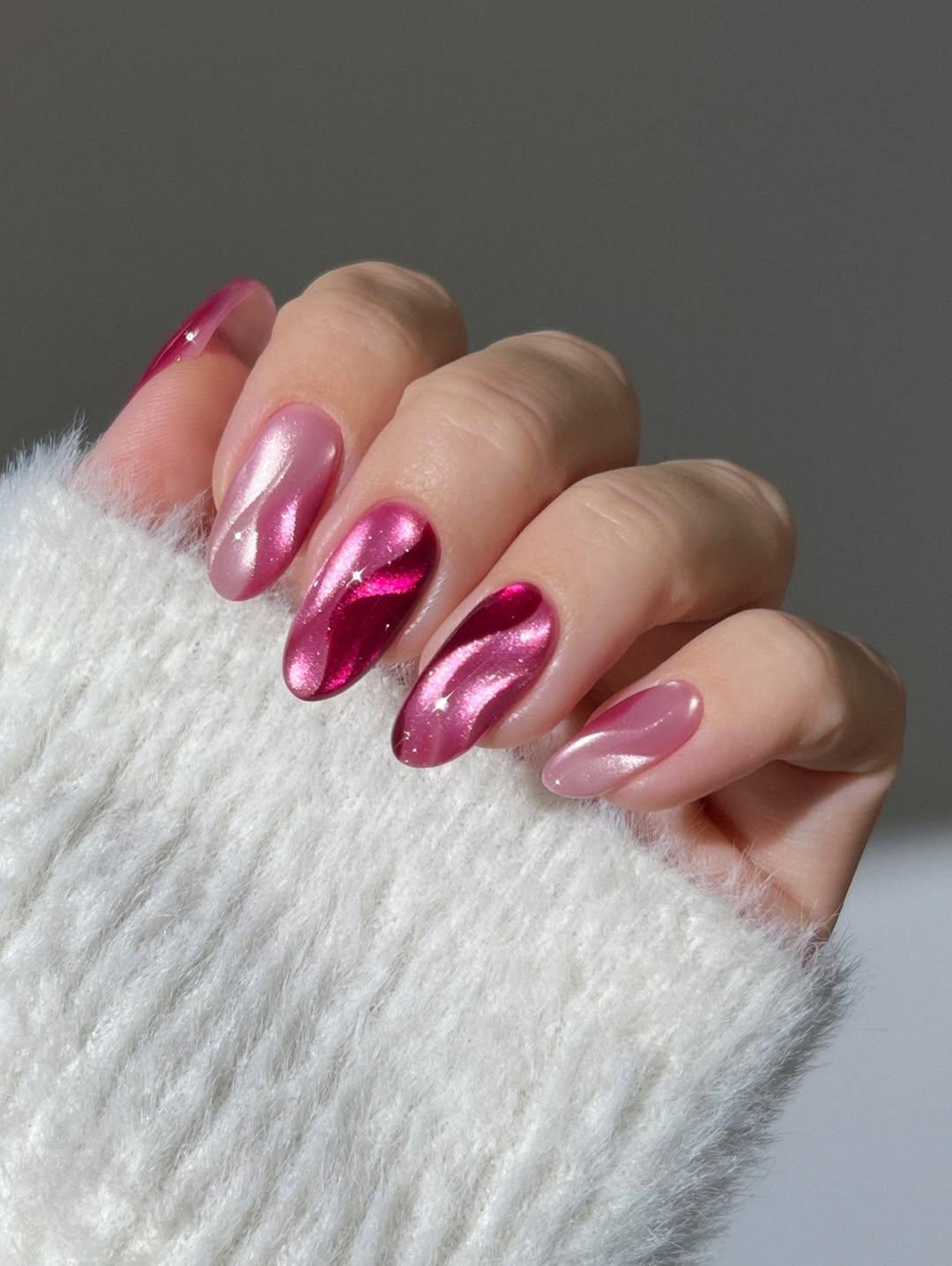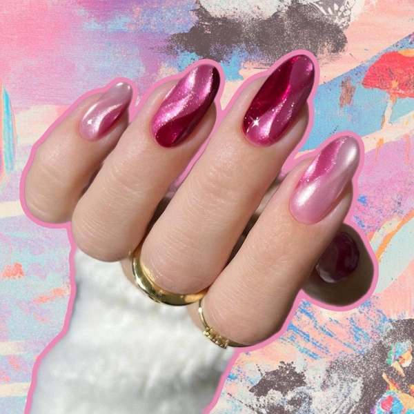 Магнитные лаки уже давно перешли из необычных корейских трендов в повседневную эстетику. Благодаря мягкому свечению, глубине цвета и бликам «кошачий глаз» делает даже самый минималистичный маникюр визуально более интересным. А розовая гамма добавляет образу свежести и весеннего настроения.