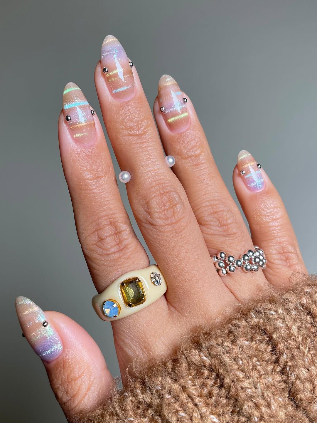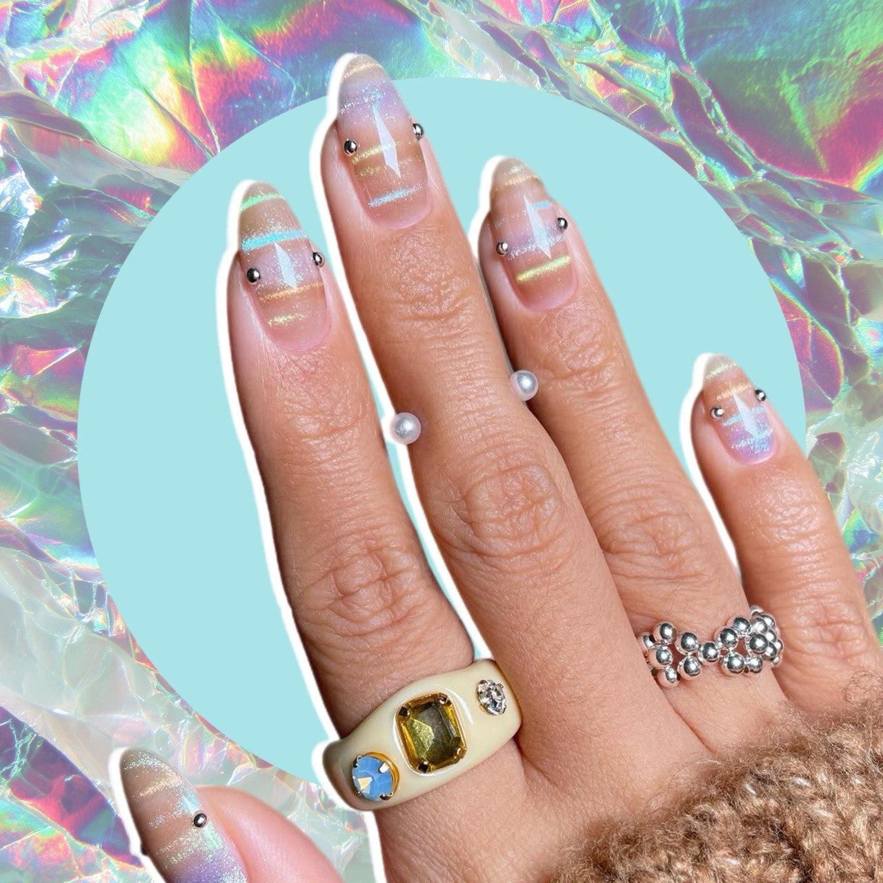 Добавь туда нюдовую базу, пастельные полоски и неожиданную деталь в виде пирсинга по краям ногтя, и получишь дизайн, который идеально вписывается в это зиму. Он выглядит свежо и чуть футуристично. Давай смотреть, как повторить такой маникюр!