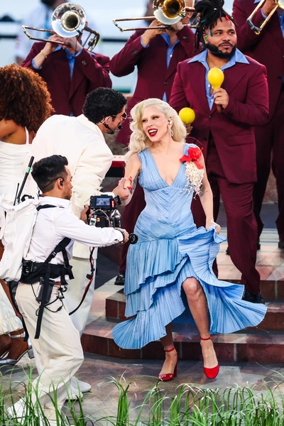Гага выбрала ослепительное платье нежно-голубого оттенка в стиле фламенко — кастомный наряд бренда Luar, который идеально смотрелся в движении. Пышная юбка, и насыщенный цвет усиливали драму выступления и создавали ощущение театральности, так характерной для сценического стиля Гаги.