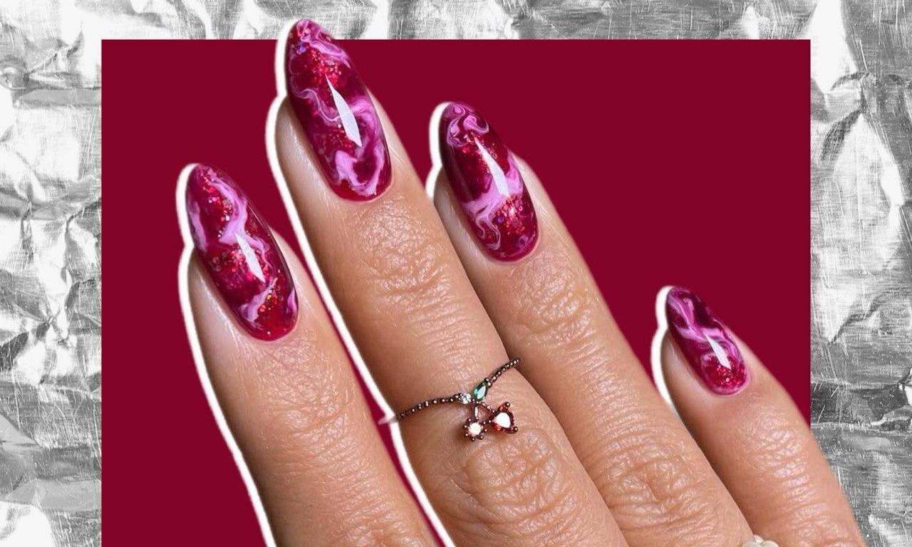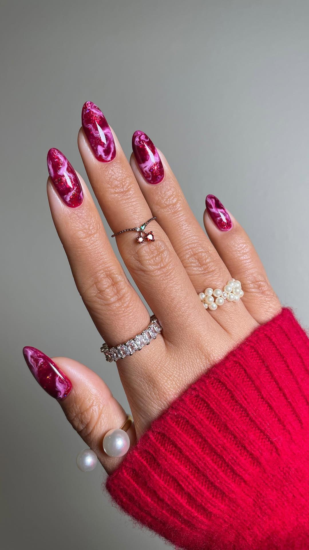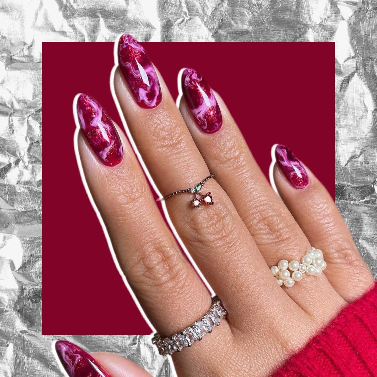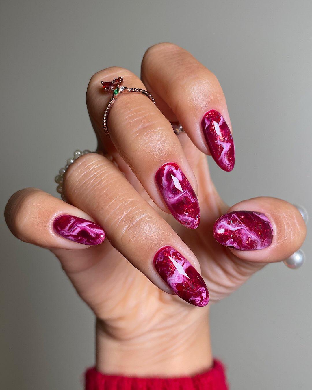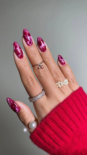 Красный маникюр с блестками и художественными разводами универсален, как ни странно. Он одинаково хорошо смотрится и на коротких, и на длинных ногтях, особенно если форма мягкая — овал или миндаль. За счет сложного цвета и абстрактного дизайна он не режет глаз и легко сочетается с зимним гардеробом.