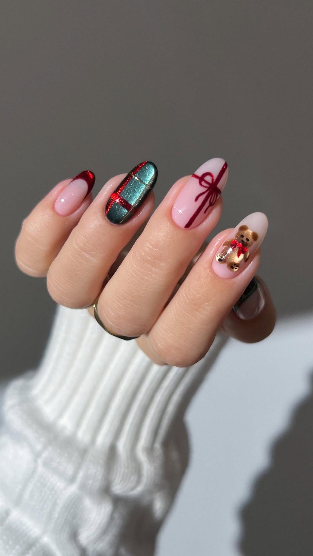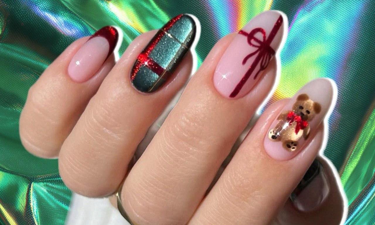 Главными цветами в нем будут насыщенный красный и изумрудный. Чтобы ногти смотрелись интереснее, лаки выбирай с эффектом «кошачий глаз». Деликатные блестки и переливы заставят ноготки выглядеть по-настоящему дорого, а этого и нужно добиваться в этом дизайне. Еще будем рисовать мишку, так что не забудь и про коричневый «кошачий глаз».