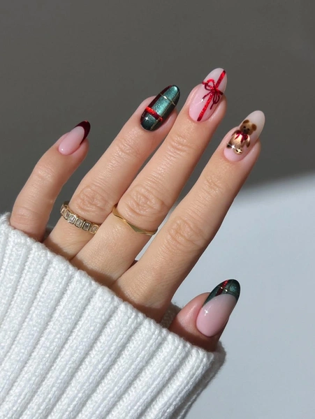 Еще на одном ногте можно сделать то же самое, но в зеленом цвете. На этом же френче можно нарисовать клетчатый принт красным «кошачьим глазом» и кремовым зеленым цветом. Такой узор добавит тот самый вайб уюта и роскоши.