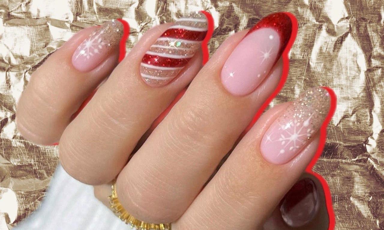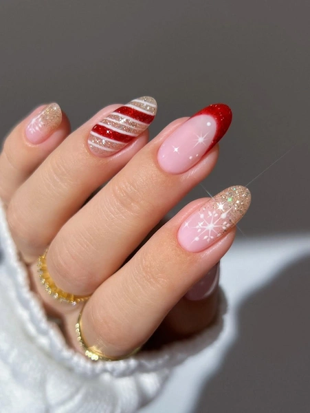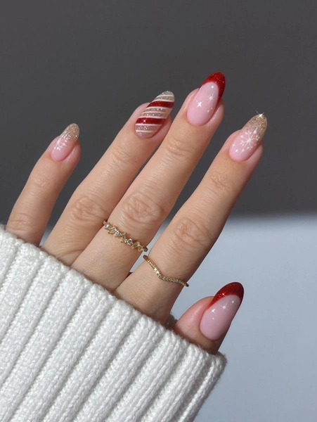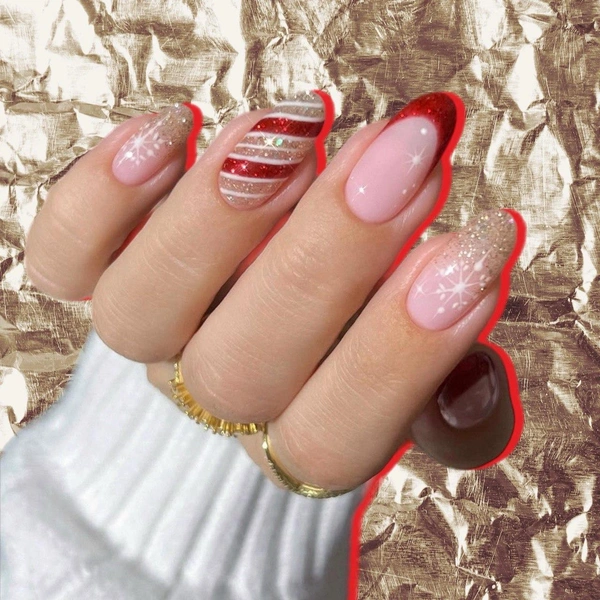 Я нашла красивую идею дизайна, которая тебе точно понравится. В ней сочетаются красный и золотой с белым лаком — цветом зимы и снежинок. В нем есть обычный френч и градиентный, полоски и зимние узоры. Смотри и повторяй 👇