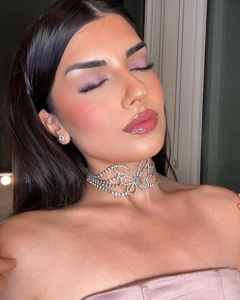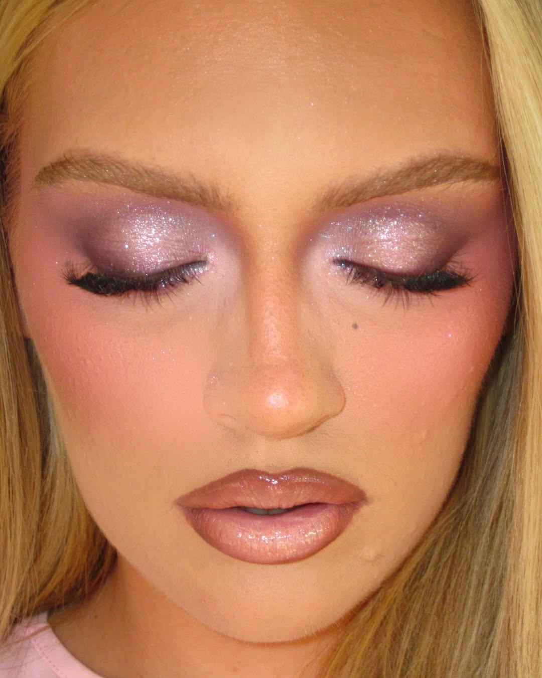 Этот макияж полностью сделан в лиловой гамме: от теней и блесток до карандаша для губ с помадой. Такой монохром смотрится очень нежно! Несмотря на блестки на веках и довольно яркий контур, этот макияж выглядит женственно и мило. Для дневных выходов он не подойдет, но на вечер — самое то.