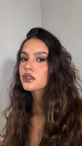 Это чуть более яркий макияж, поскольку в нем сделан акцент и на глаза, и на губы. Губы, кстати, такие же коричневые, как и у Уиллоу Смит, но эта девушка выбрала комбо холодного коричневого карандаша и красноватого глянцевого блеска. На ее щеках заметны лиловые румяна. А глаза она подчеркнула коричневыми тенями на всем веке и сияшками в уголке.