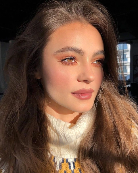 В этом макияже сочетаются оттенки сразу всех температур. Во-первых, на глаза девушка нанесла коричнево-песочные тени. Они делают взгляд мягче, а еще немного скульптурируют веко. Во-вторых, для щек она выбрала довольно прохладные розово-лиловые румяна. Такой контраст уже выглядит круто. А в-третьих, она выбрала помаду вполне нейтрального оттенка: он коричневый, но не очень теплый.