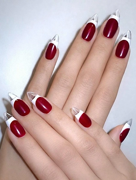 Сначала округлой линией красного цвета обведи ногтевую пластину. Затем закрась этим же лаком все пространство ниже этой полоски. Должен получиться эффект коротких ногтей, будто бы у тебя длинный прозрачный кончик и небольшой натуральный ноготок, окрашенный красным.