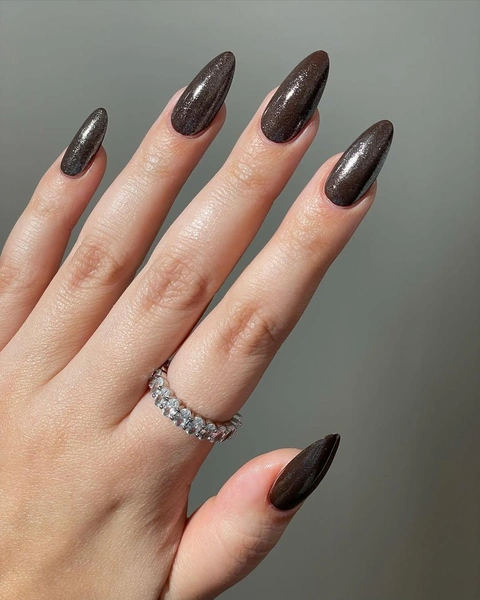 Икорный маникюр — это не про текстуру, а про роскошные темные переливы. Ногти могут быть коричневыми или черными, но важно, чтобы они сияли без крупных блесток. Я нашла несколько крутых вариантов. Повторяй и будь самой роскошной в эти праздники!