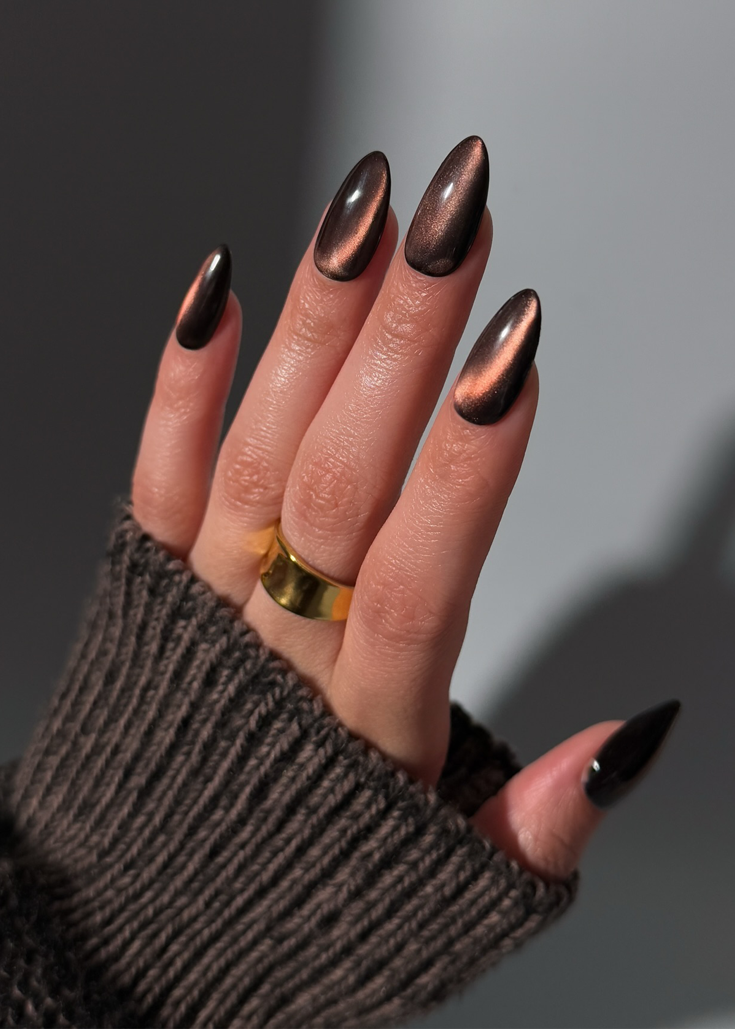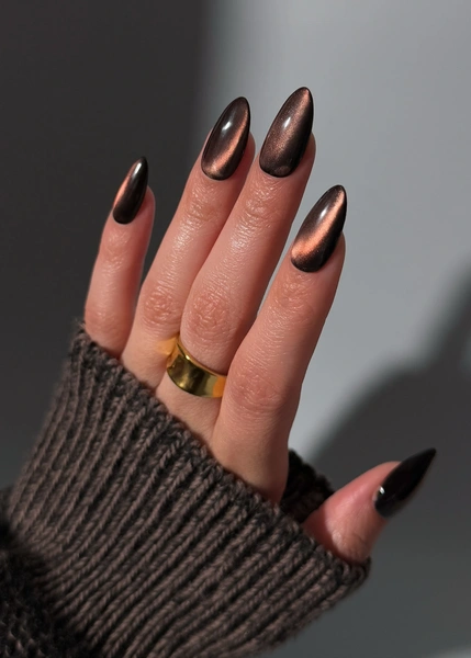 Коричневый «кошачий глаз» — один из самых роскошных вариантов. Глубокая база цвета темного шоколада с магнитным сиянием янтаря выглядит совсем как черная икра под новогодними огоньками гирлянды. Кажется, что по их поверхности движется свет. Так что ногти с таким покрытие выглядят завораживающе, их хочется рассматривать еще и еще.