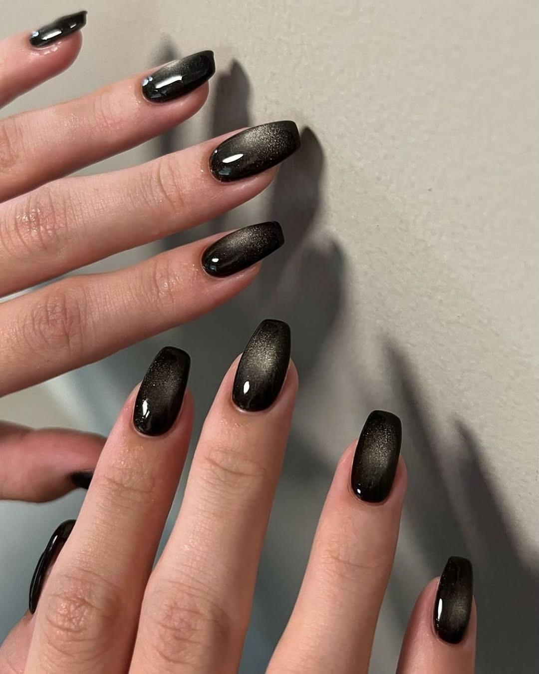Самый трендовый вариант икорного дизайна совмещает в себе ауру и магнитный эффект. Черная база с серебристым шиммером и бликом в самой серединке смотрится просто роскошно! Такие ногти просто невозможно не рассматривать, потому что под каждый углом они выглядят по-разному.