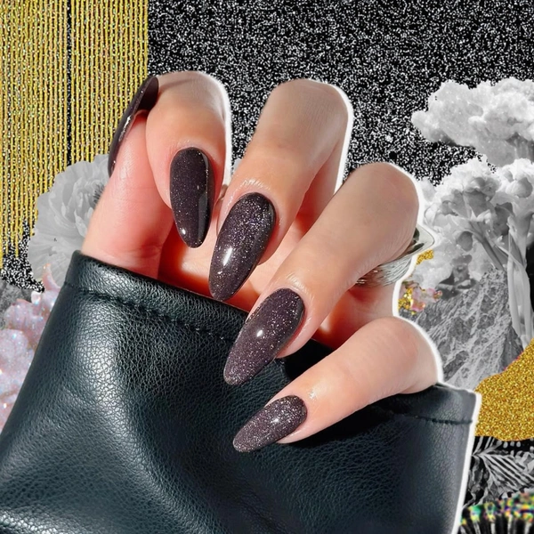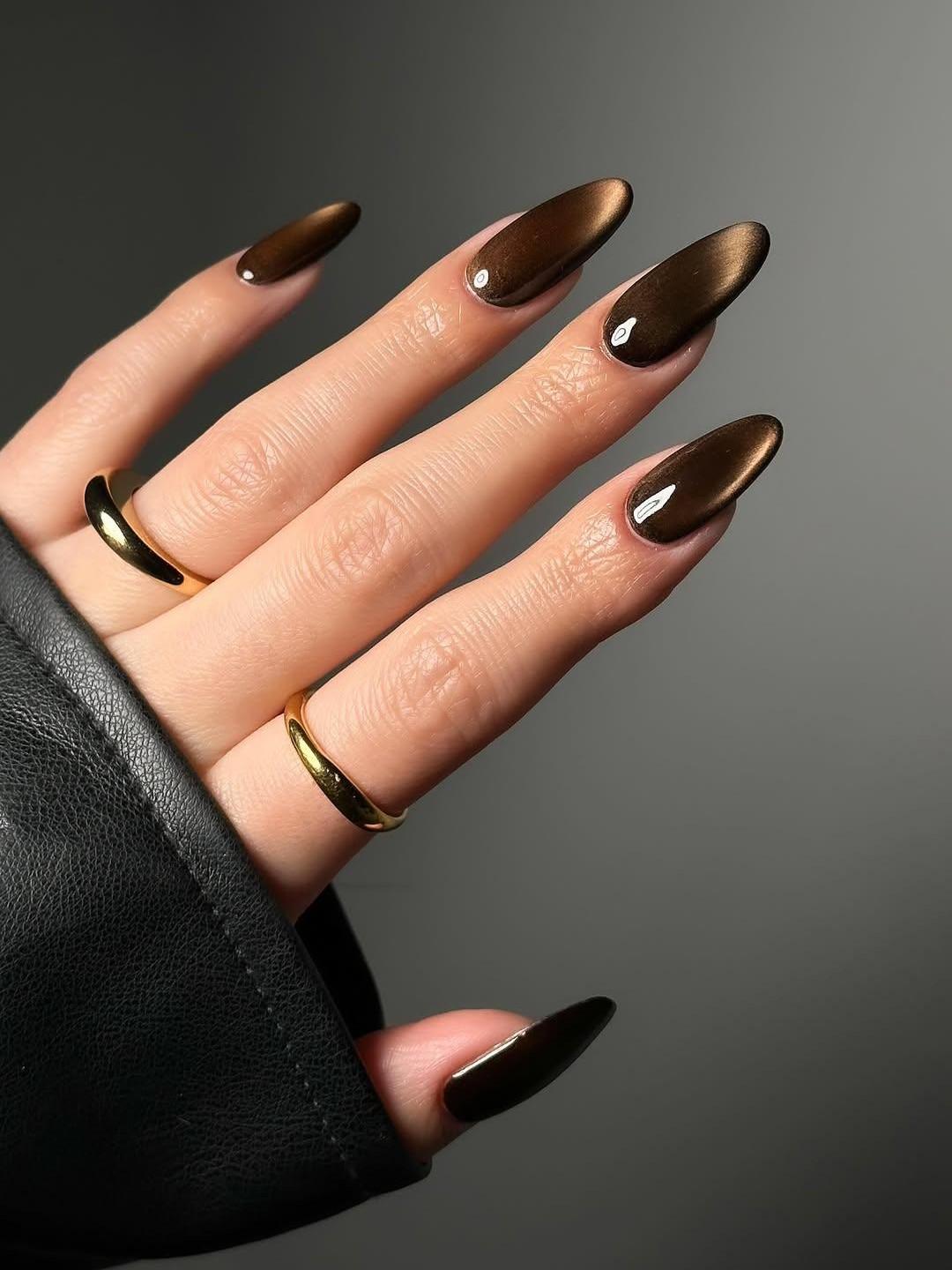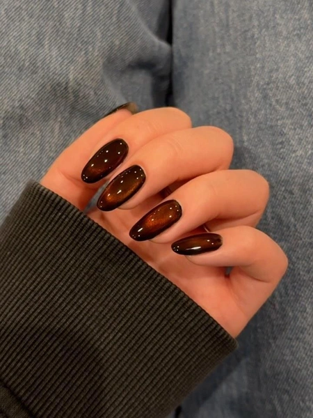 «Кошачий глаз» в маникюре тоже идеально воплощает колу. Во-первых, в таком лаке всегда есть блестки, которые выглядят как маленькие пузырьки газа в напитке. А во-вторых, в коричневом цвете магнитный маникюр всегда выглядит максимально круто.