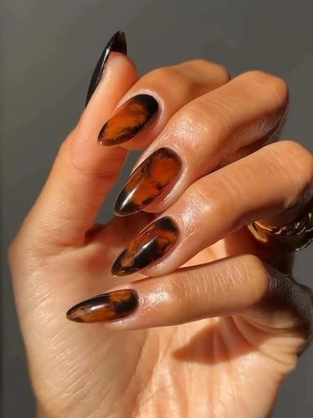 Представь, как ты наливаешь колу в стакан. Она шипит, пузырится, образует светлую пенку. Красота! Перенеси этот вайб в маникюр. Сделай мраморный дизайн ногтей с более темным и светлыми оттенками коричневого. Получится очень нарядно и свежо!