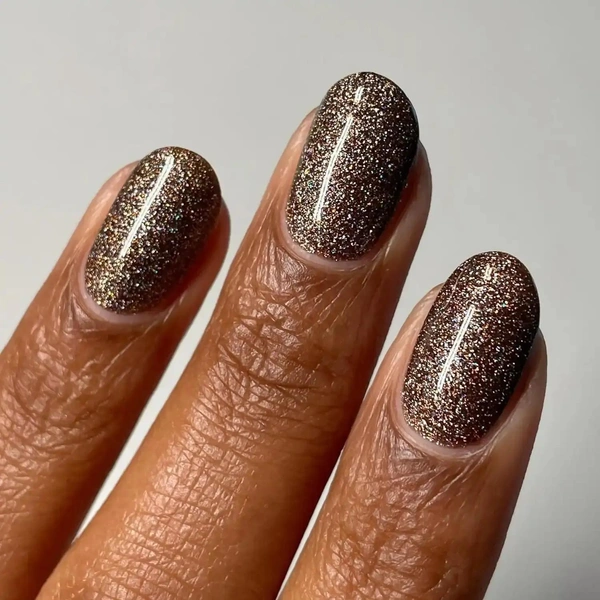 Такие маникюры бывают разными. Самый удачный вариант сделать такое покрытие — найти лак, в котором уже есть блестки. Но если в магазинах трудно подобрать вариант, то просто нанеси на ногти коричневый цвет и укрась его прозрачным топом с серебряным шиммером.