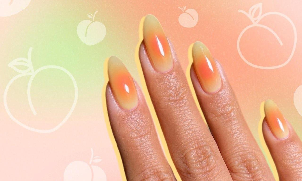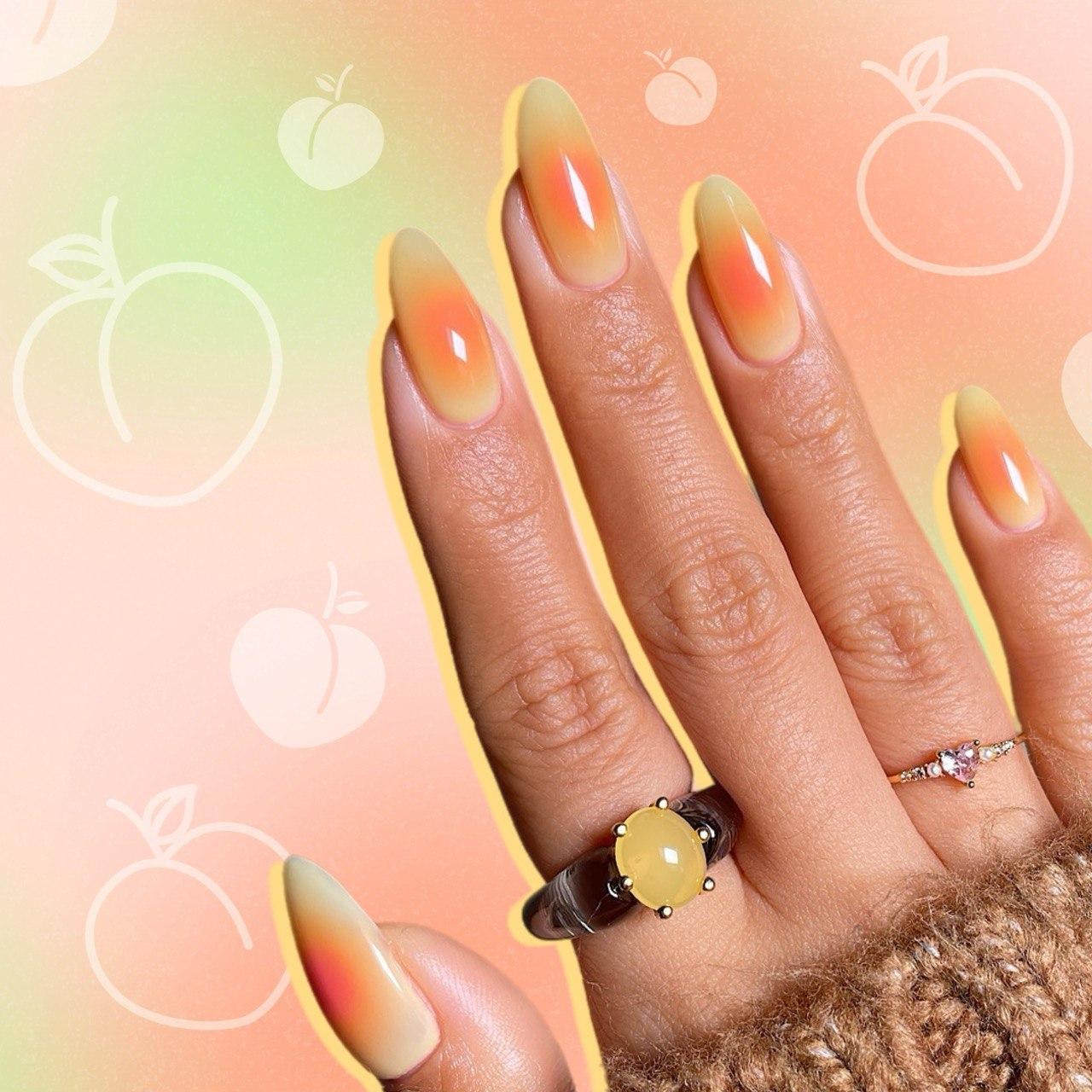 Этот маникюр напоминает персик на грани увядания — еще чуть-чуть, и он может оказаться вне твоей тарелки. Ауру можно воссоздать с помощью маленького спонжа или губки: нанеси розоватый оттенок в самый центр, а по краям оранжевый. Если рисунок получился слишком четким, растушуй его тонкой кистью. Несколько притаптывающих движений по желтой базе — покрыть топом и готово!