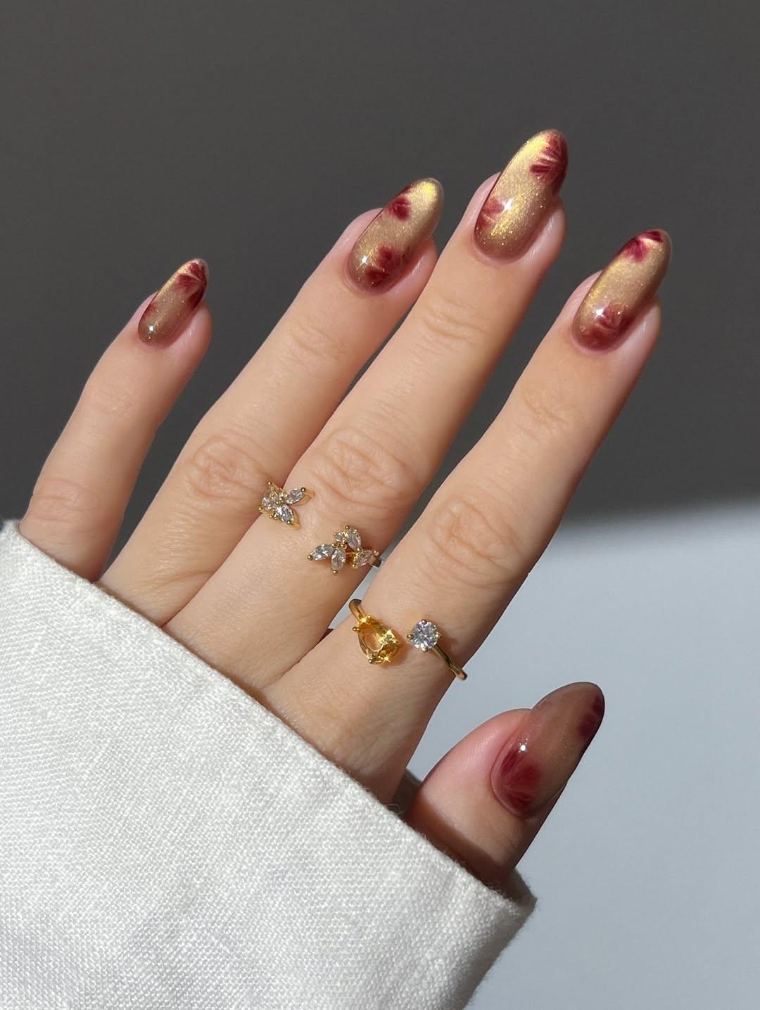 Для начала стоит нанести серебряный лак, а после подсветить его магнитом для «кошачьего глаза» со всех сторон. Дальше — красно-коричневый, на котором нужно нарисовать акварельные линии тонкой кистью, максимально растушевывая их. Теперь можно надеть пару колец и поделиться своим необычным дизайном в социальных сетях!