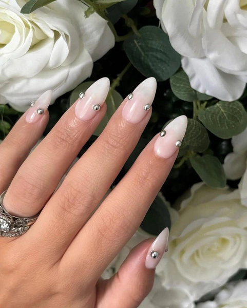 Самый простой маникюр с пирсингом — это серебристые объемные шарики-сережки, расположенные по обе стороны ногтя. Такое расположение элементов напоминает некоторые виды украшений для проколов брови или пупка, а не классические висячие серьги для ушей. Изящной базой для дизайна станет однотонное молочное покрытие.
