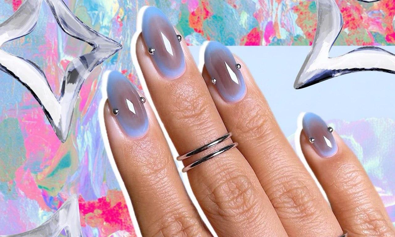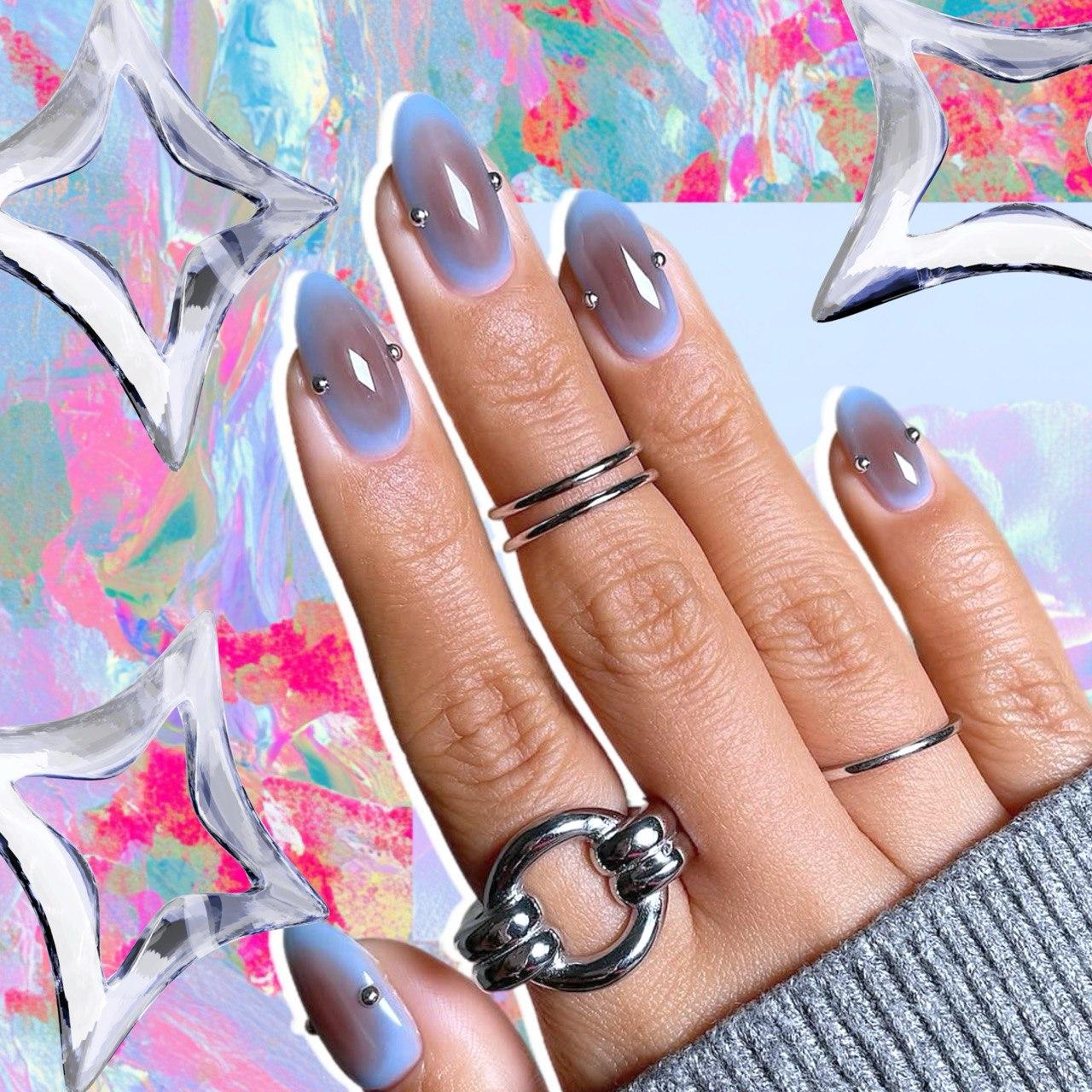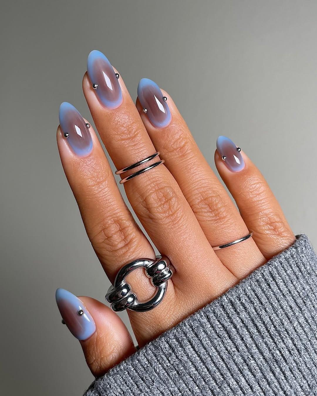 А тем, кто хочет оставь пирсинг на всех ногтях, но дополнить его чем-то интересным, есть красивое сочетание «проколов» и ауры. На небесно-голубом фоне такой дизайн будет смотреться просто прекрасно! Нарисуй коричневую ауру, а потом добавь серебристые объемные «сережки».