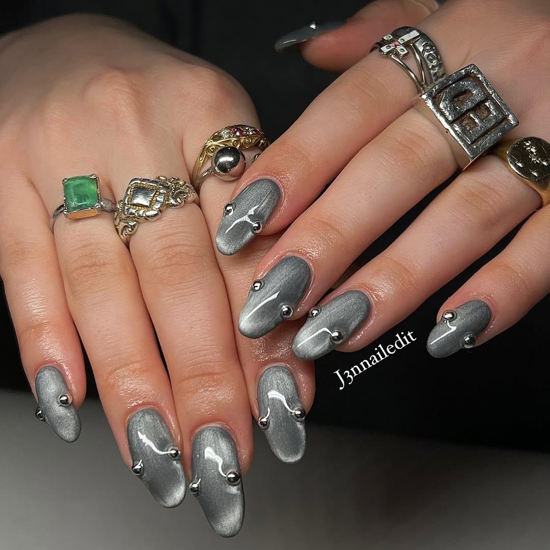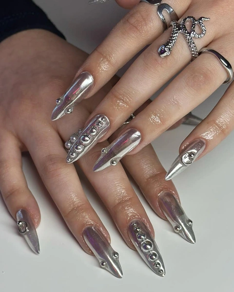 Серебряные ногти уже стали классикой, ими никого не удивишь. Поэтому появляется желание как-нибудь их разнообразить. Например, добавить пирсинг и стразы. Экспериментируй с видами сережек и размером объемных деталей, чтобы сделать свой маникюр по-настоящему уникальным!